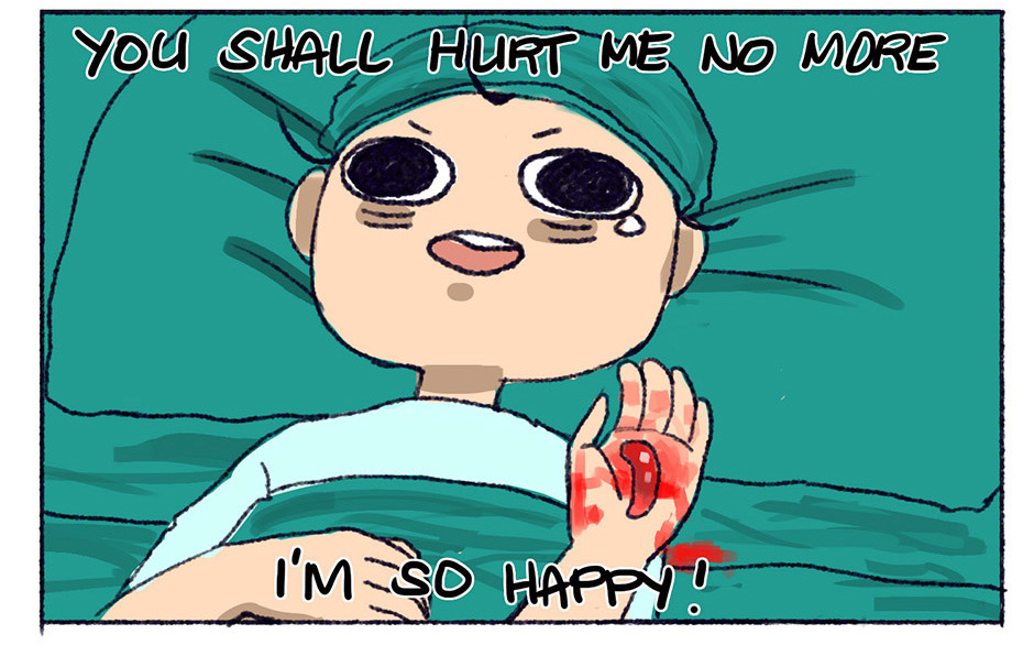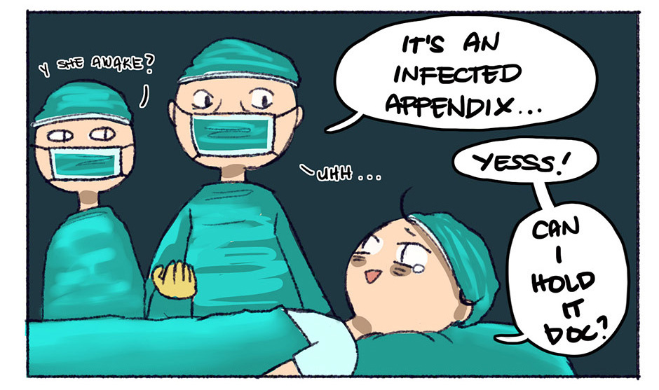 Xian: "What if Appendectomy was like-- child birth?" We had a laugh at this idea and it really hurt to laugh XD