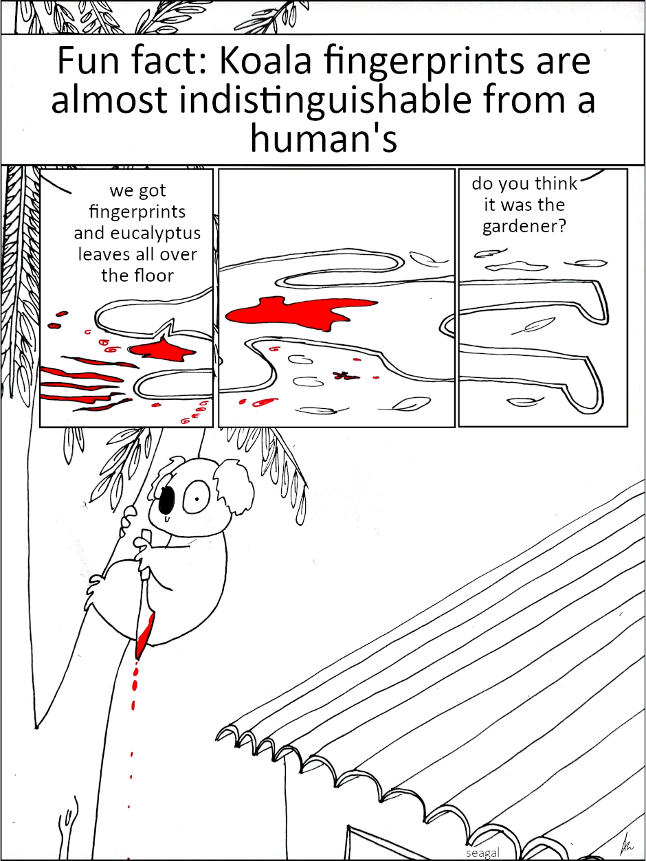 [Image description: on top of a white panel there is a text that says: “Fun fact: koala fingerprints are completely indistinguishable from a human's”. In the next panel, there is a blood-stained human shape drew on the floor. There are leaves on the floor. Two off-screen policemen are saying “we got fingerprints and eucalyptus leaves all over the floor” “do you think it was the gardener?” In the last panel there is a koala outside, hanging on a eucalyptus tree, holding a blood-stained kitchen knife in its hand, with a smirk on its face]