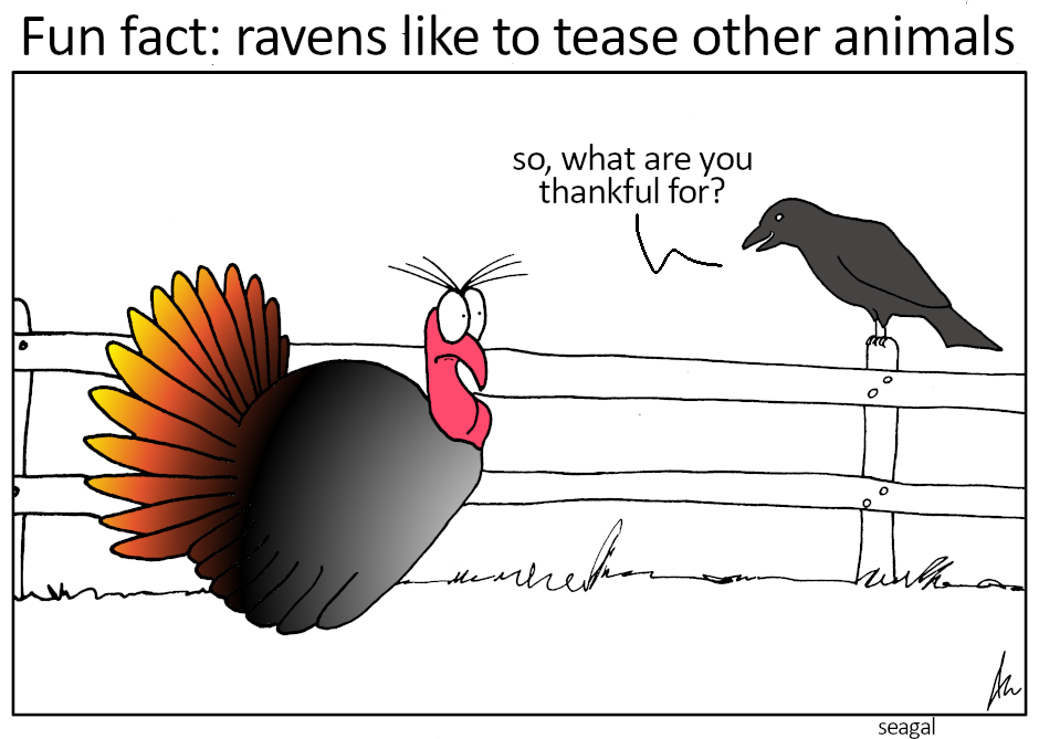 [Image description: on a white rectangular panel is a text that says “Fun fact: ravens like to tease other animals”. In the panel there are a turkey and a raven, looking at each other. The raven is smirking and saying “so, what are you thankful for?” while the turkey looks at him annoyed.]