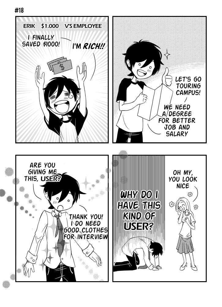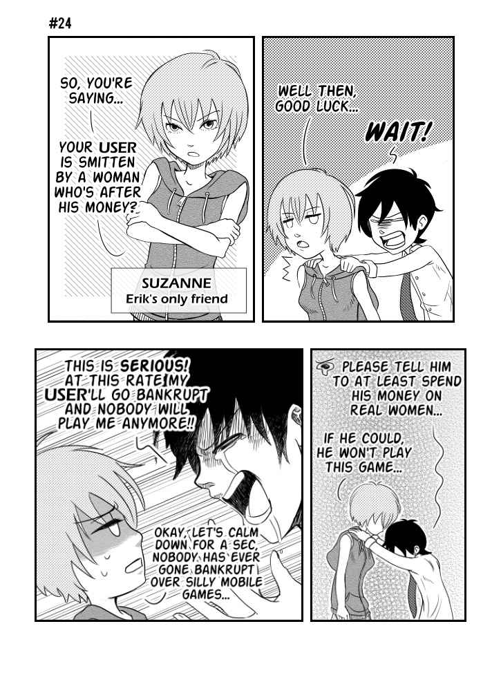 Erik is a game character from freemium mobile game called Virtuality. He just wants to live his (game) life normally: go to college, get a job and a girlfriend, but what should he do when his USER has his own plans for him?