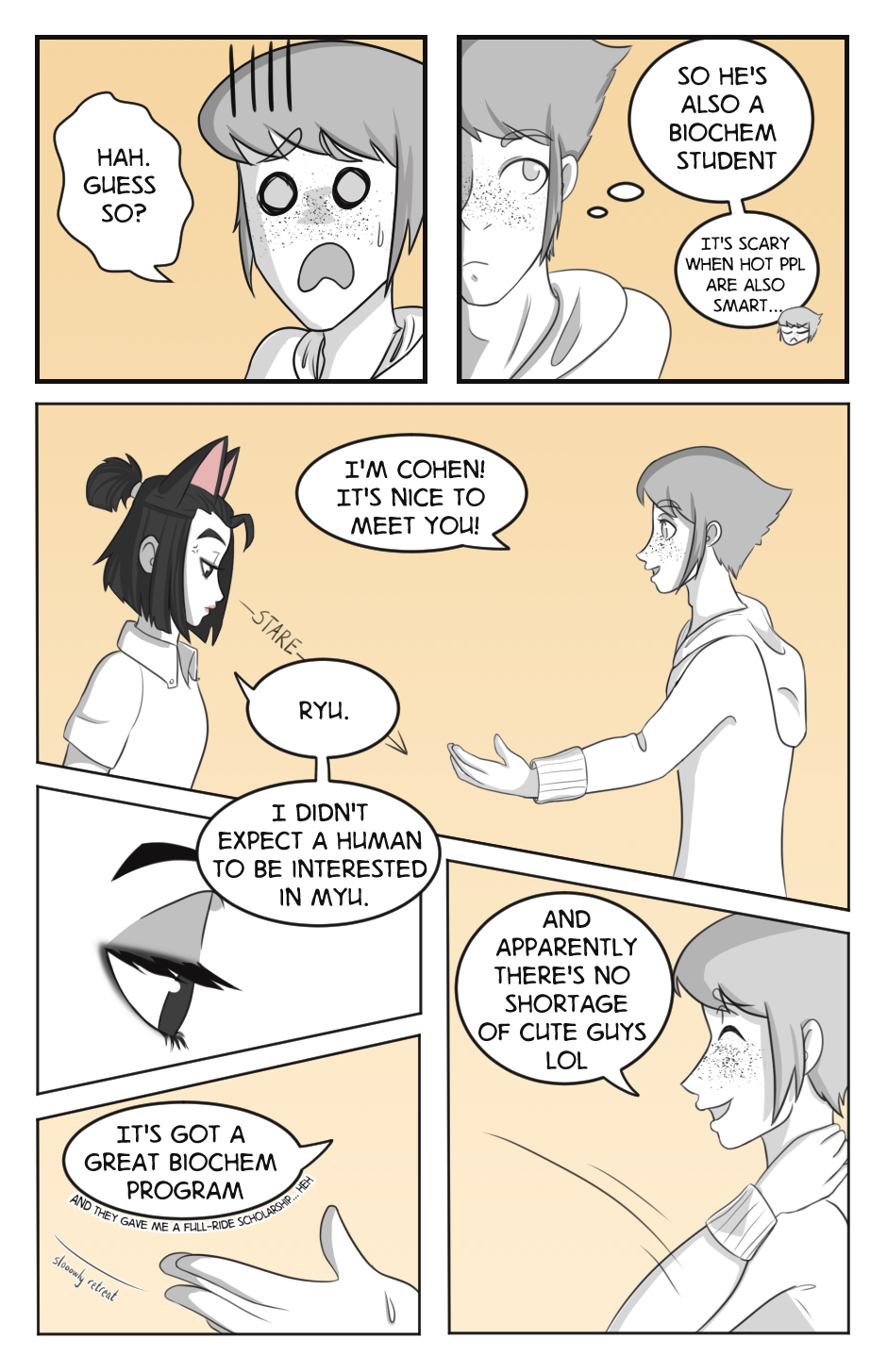 Cohen Rhodes earns a full-ride scholarship to MYU, a prestigious and predominantly catkind university, where he meets Ryunosuke Ishimura, one of the scholarship runner-ups. The ever-prickly Ryu shies away from Cohen's energetic attempts at friendship.