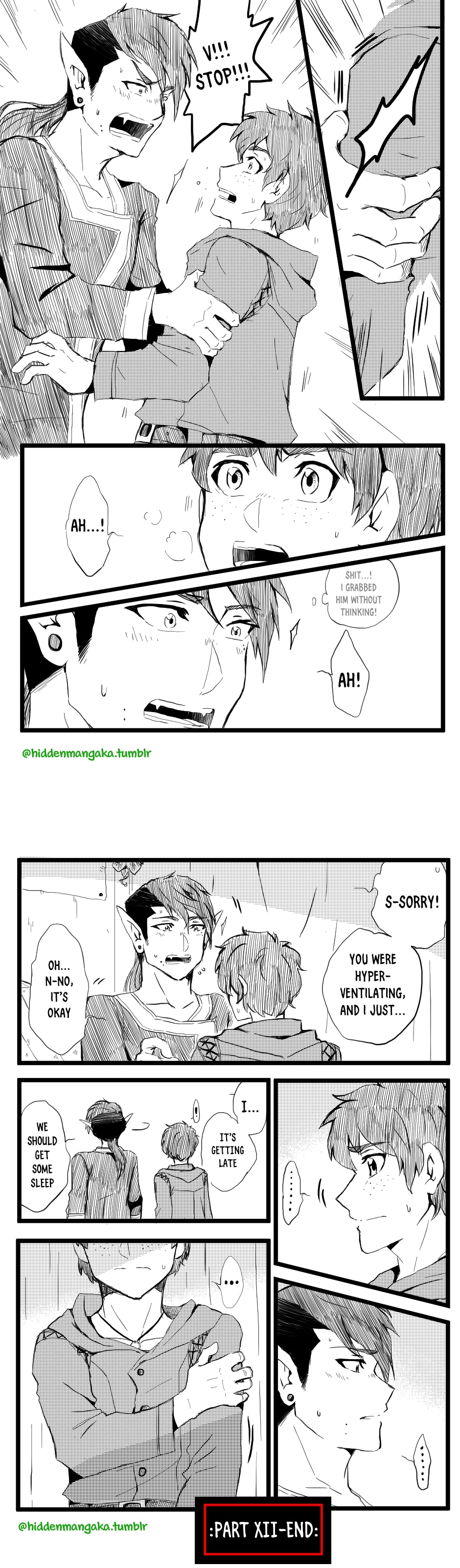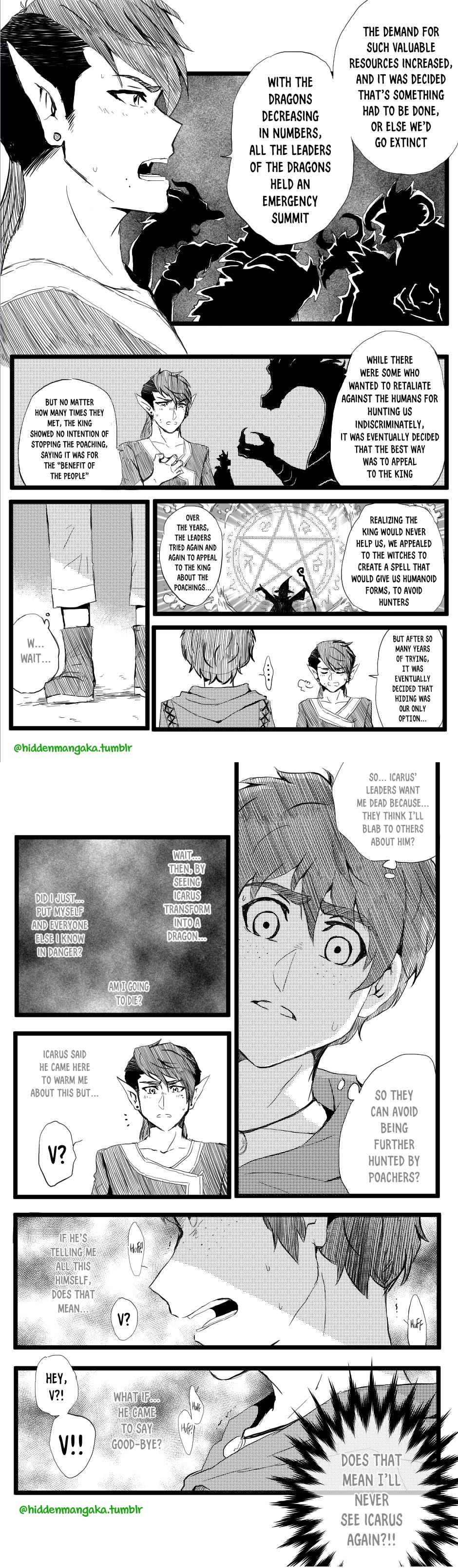 In this fantasy-adventurer AU, V (thekao) is a witch-class adventurer everyone avoids; due to his clumsiness and inability to perform his spells successfully in front of others, V is humiliatingly known by the other adventurers as "V the Destructor." But when the enigmatic Icarus (icarusmask) joins him, V soon gets involved in a crisis that involves Icarus and the entire kingdom!