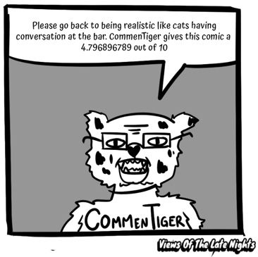 Ever wonder what animals are thinking while they are trying to get away from the everyday stresses of their life? Read the comic strip to follow the lives of cats, Shilt and Lawson, dogs, Como and Bennett, and various other members of the animal World. Within the night they escape to Late Night View - a late night bar for animals - and during the day they live the normal lives of animals.
