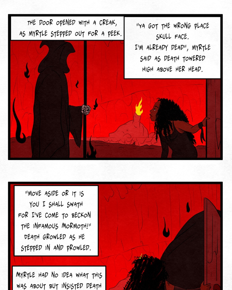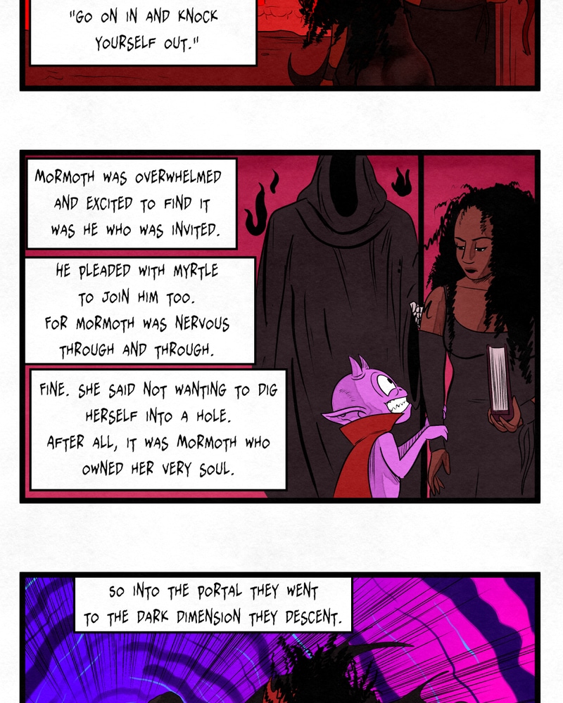 Step into the Third Circle of Hell and witness the zany adventures of Mormoth, the incompetent, cowardly demon! Accompanied by his cynical virgin sacrifice; Myrtle, the road to becoming a successful tormentor may prove to be quite challenging indeed. Will Mormoth grow the minerals to inflict punishment on the eternally damned? Or will he continue to disappoint his family until his father eats him? Whatever happens, it's gonna be a helluva fun time! Updates: Tuesdays and Fridays EST.