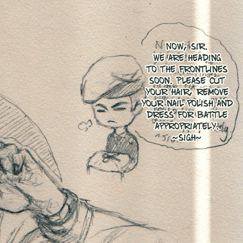 Quite honestly, this is just a very not so thought of comic. I originally only drew the first panel traditionally out of boredom but I got some people asking for a continuation and this is what came out. >< (I realized that it is ridiculous of the military to permit an official to grow his hair out and paint his nails. )No title and no names yet since I probably wouldn't be drawing a lot of them again.