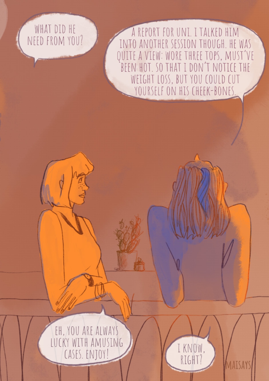 In this comic there will be a lot of aesthetics of post-Soviet cities, references to books and films. There will be amateur arguments about philosophy and warm and comfortable conversations.
