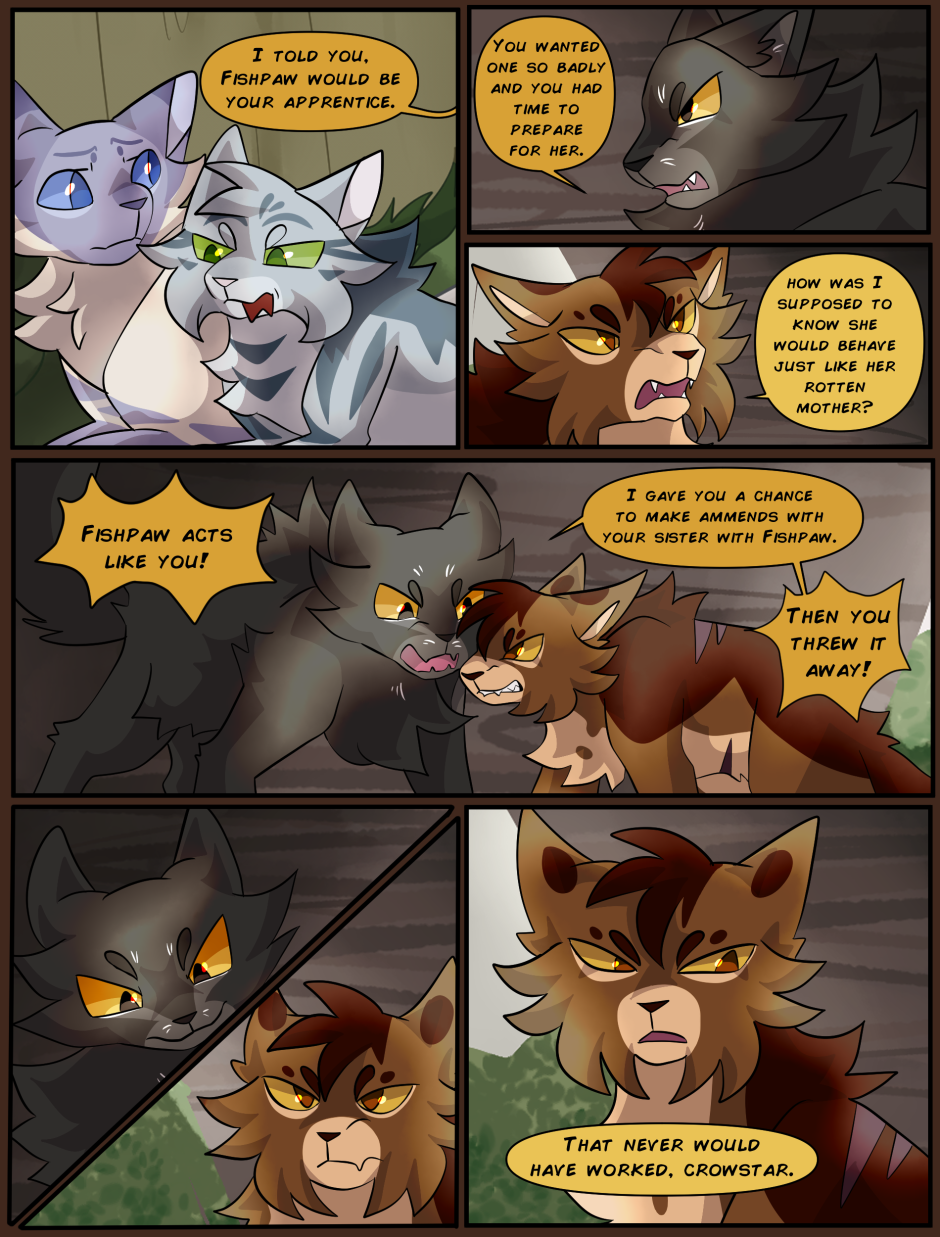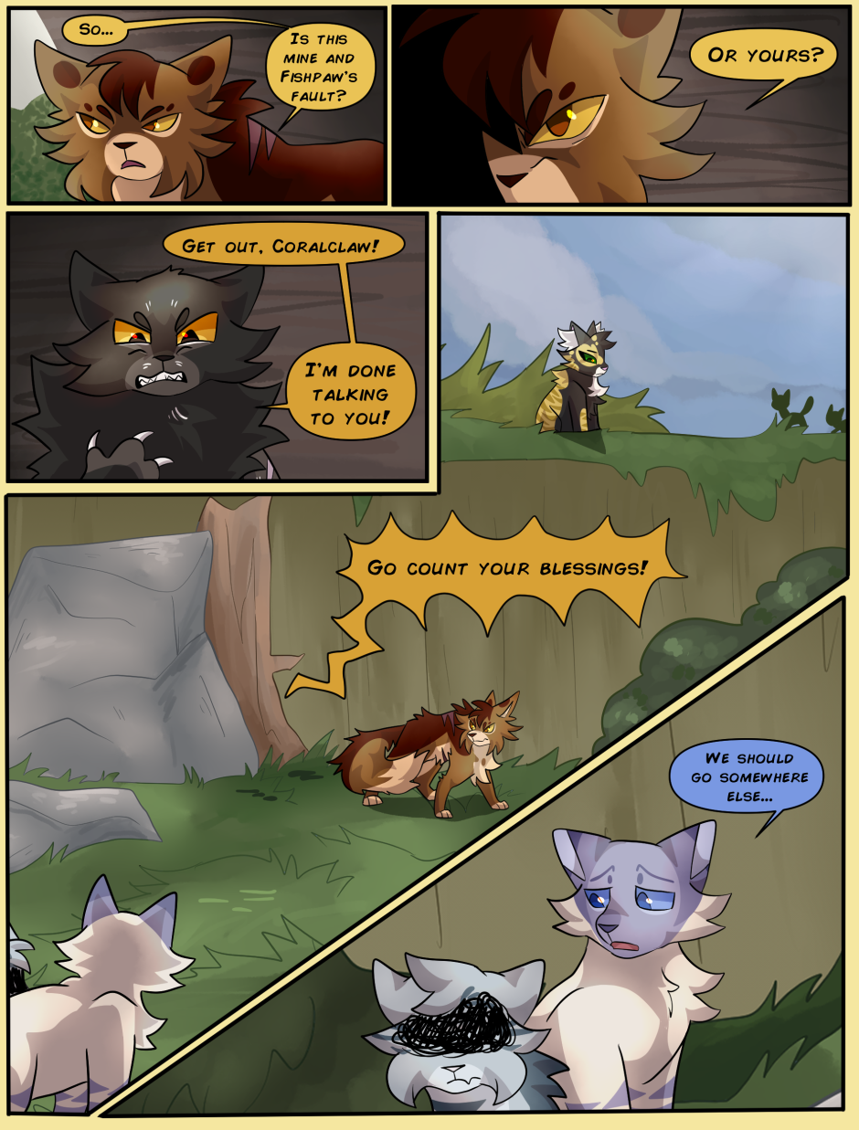 There are two clans in this setting, Oceanclan and Treeclan. Oceanclan lives near the beach, and Treeclan lives in the woods behind them. The two clans have had high tensions for many years, two new leaders made a pact for peace but issues start arising and reasons to fight keep appearing. Fishpaw is a warrior apprentice during this time, and she has her own personal struggles to deal with. Her destiny leads her down a dark path and and when a strong force of evil takes control, will Fishpaw and her friends come out on top... or will they perish?