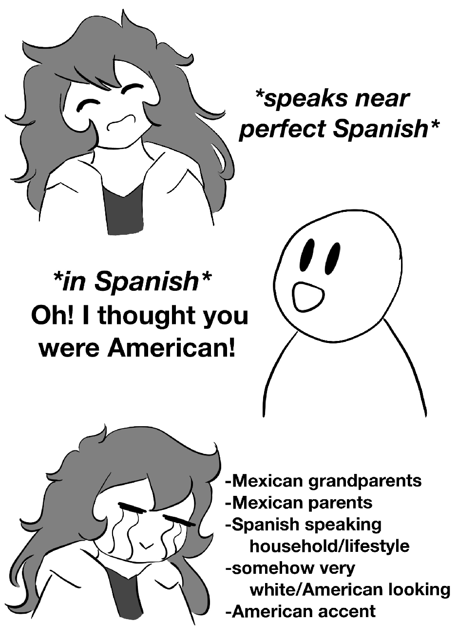 Good morning! I am Hispanic with Hispanic parents raised in a Hispanic household and I speak Spanish fluently. I am physically very white (partially because I do not leave my house partially because I, well, just don’t tan)