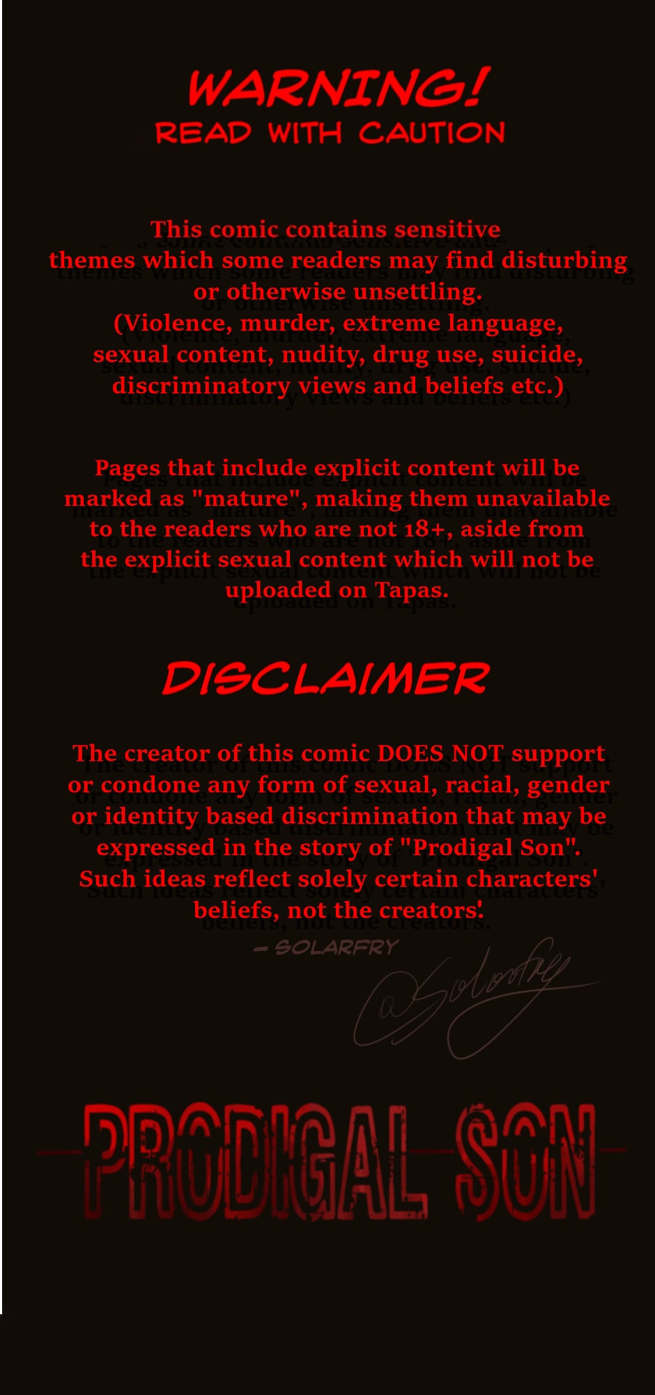 The comic will never contain gore, graphic violence and pages with explicit content will only be available on my Patreon (once I finally establish it). Nonetheless, if any of these themes upset you, please do not read Prodigal Son!