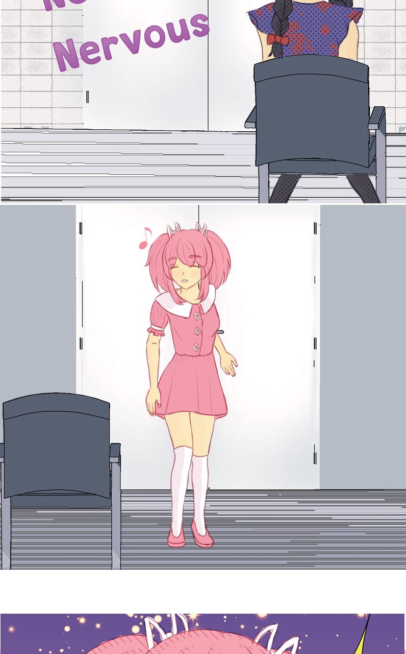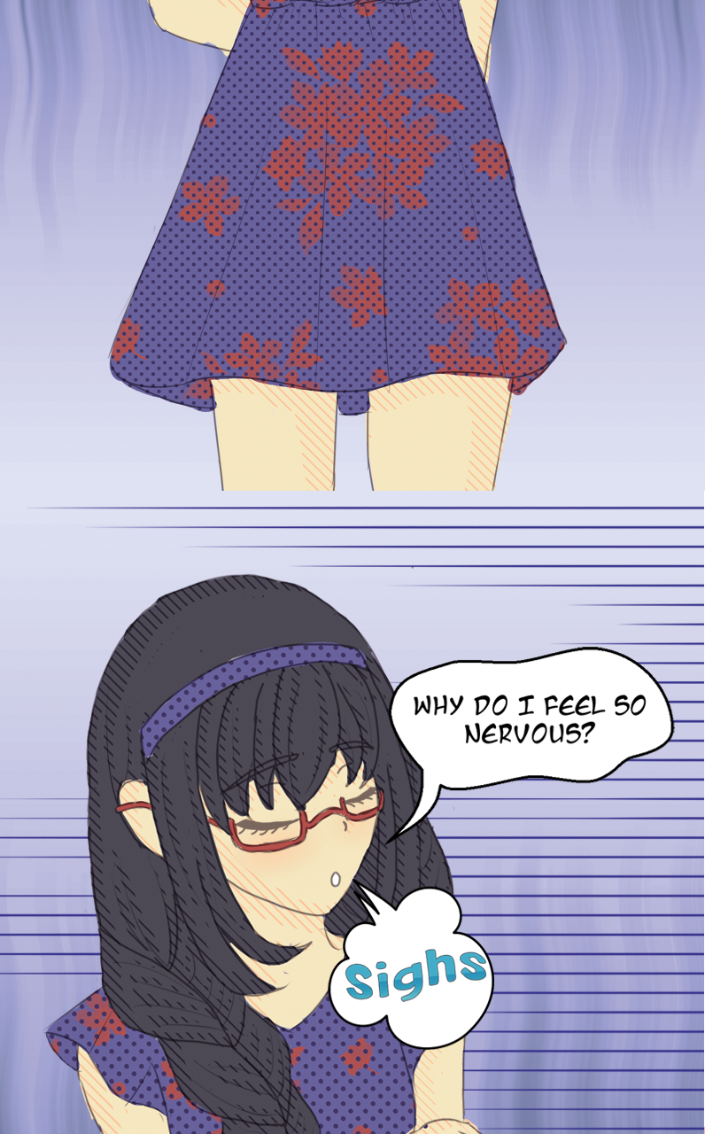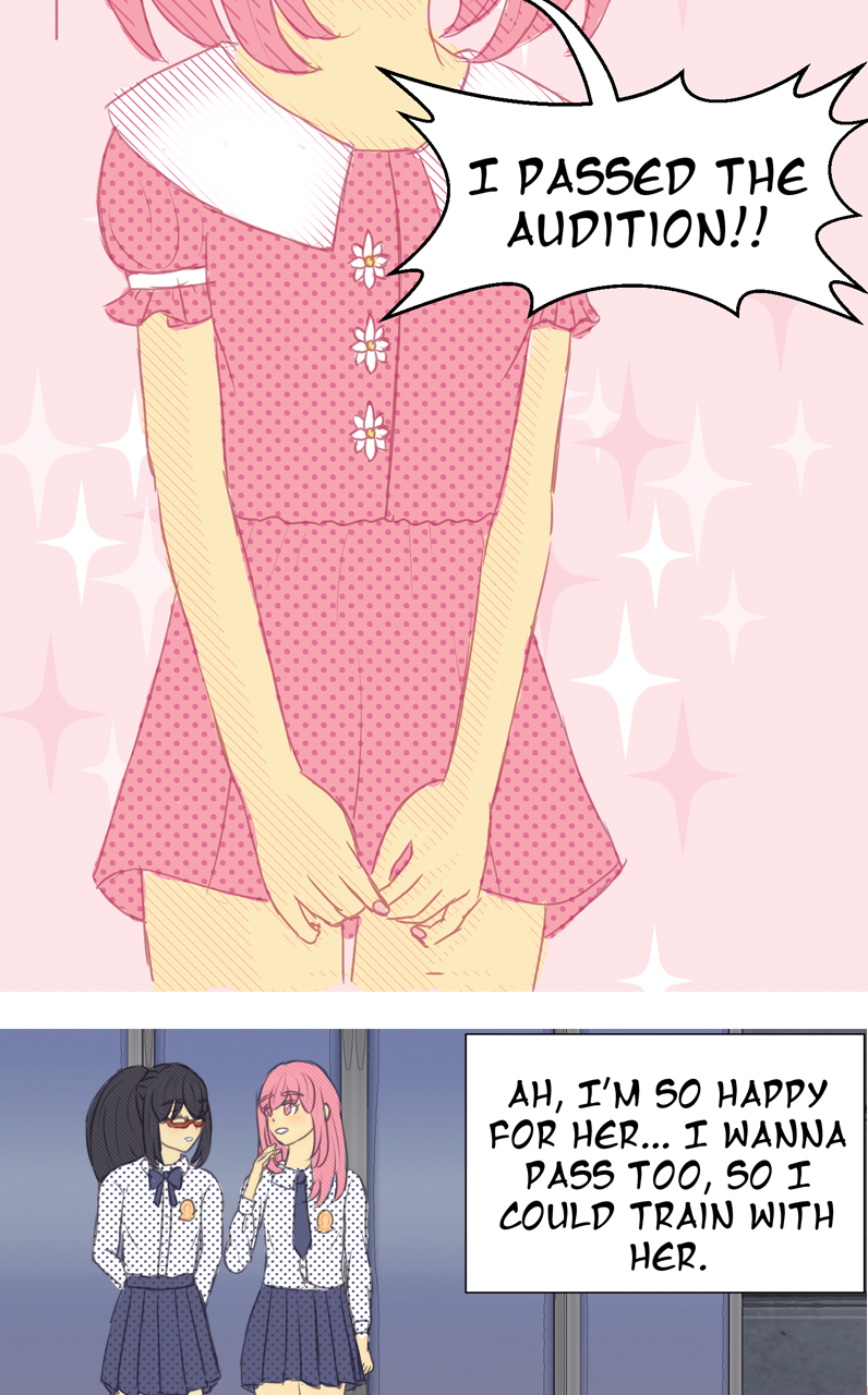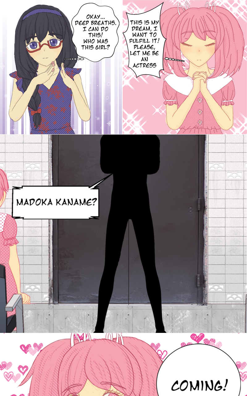 Madoka goes into her audition and passes. Homura goes into her audition too. She wants to pass to escape her life until that point. A year after she passes she comes forward with another goal, to befriend Madoka.