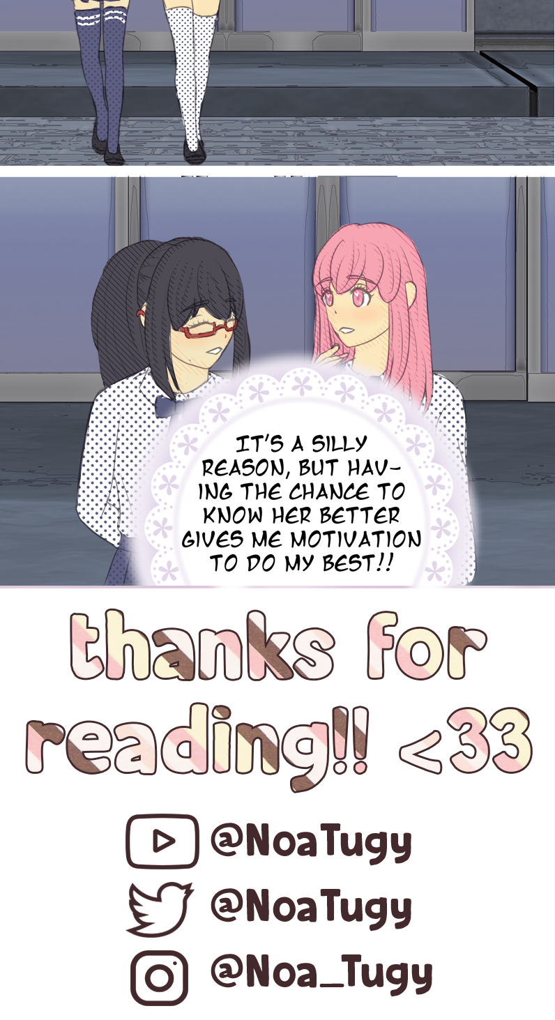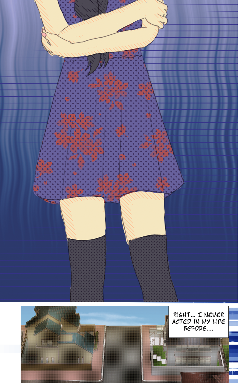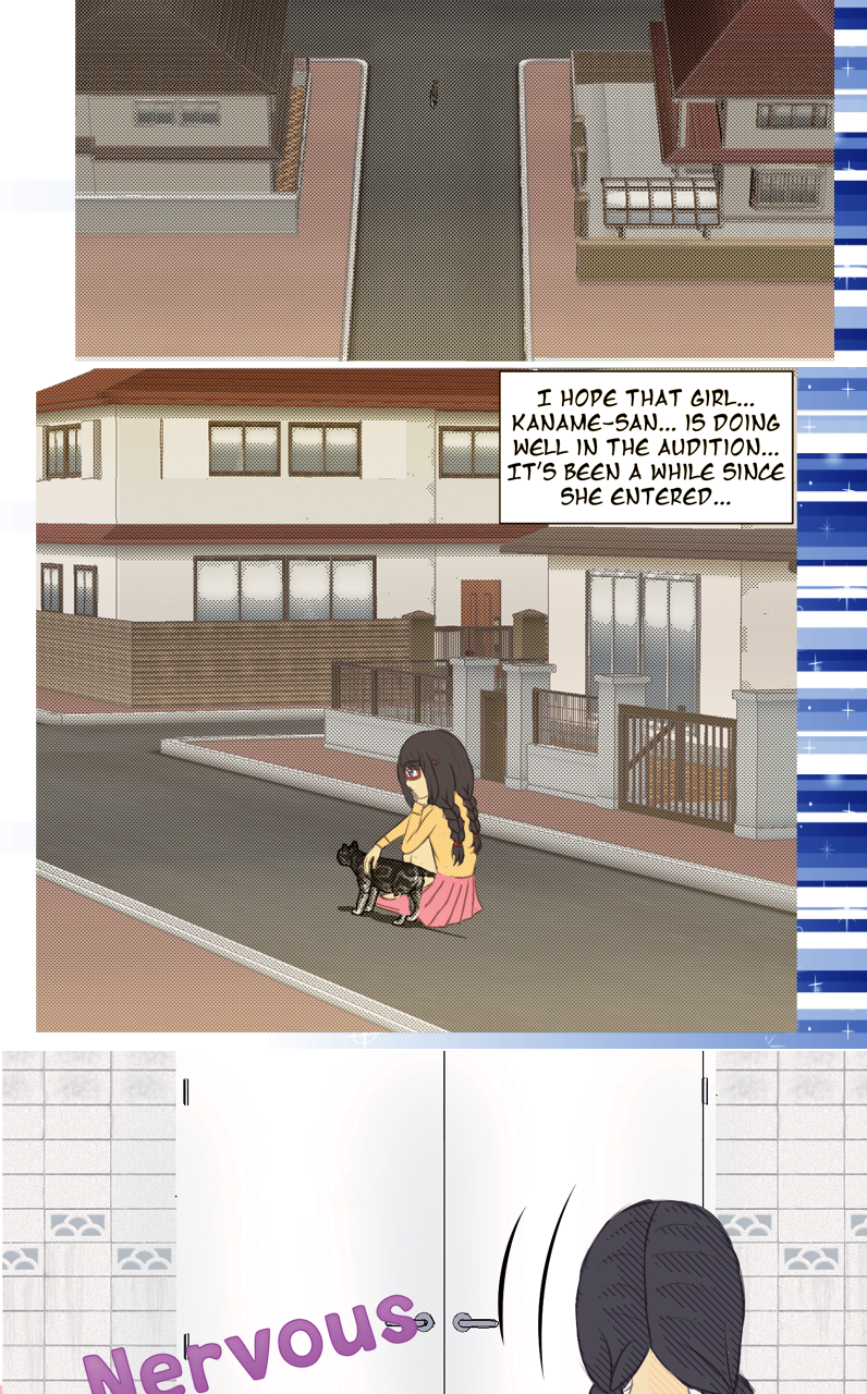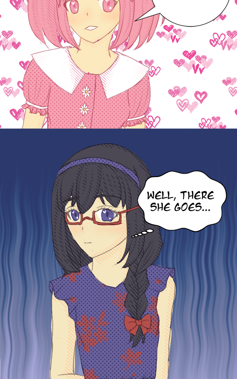 Madoka goes into her audition and passes. Homura goes into her audition too. She wants to pass to escape her life until that point. A year after she passes she comes forward with another goal, to befriend Madoka.