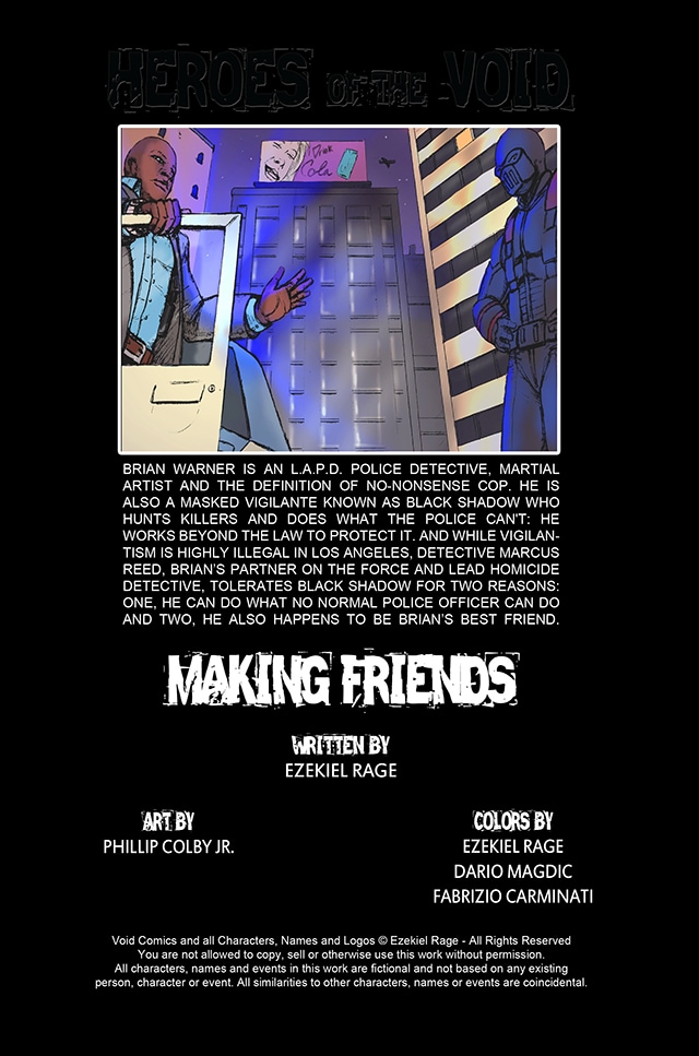 Brian Warner is an L.A.P.D. police detective, martial artist and the definition of no-nonsense cop. He is also a masked vigilante known as Black Shadow who hunts killers and does what the police can't: He works beyond the law to protect it. And while vigilantism is highly illegal in Los Angeles, Detective Marcus Reed, Brian’s partner on the force and lead homicide detective, tolerates Black Shadow for two reasons: One, he can do what no normal police officer can do and two, He also happens to be Brian’s best friend.