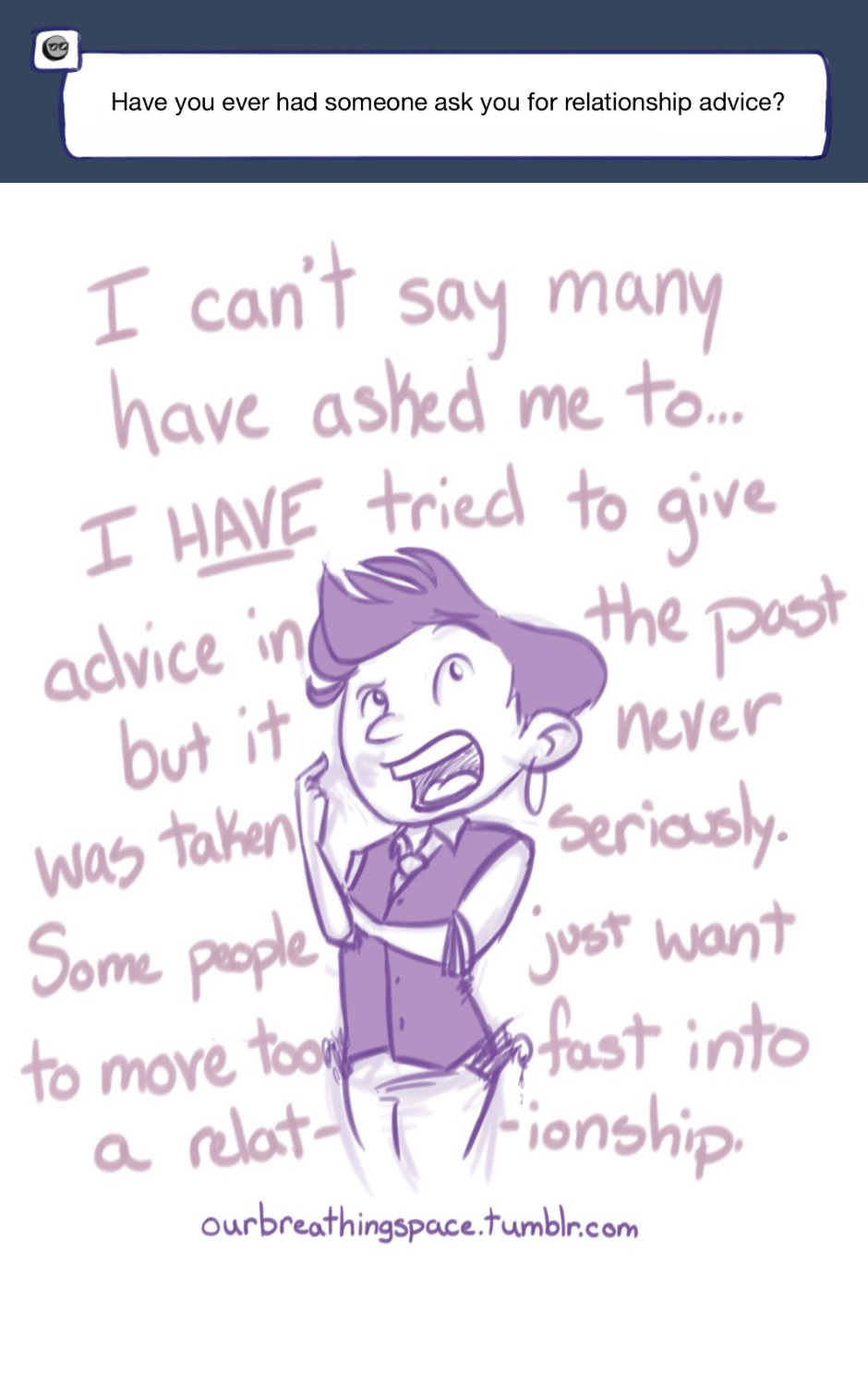 Relationship advice? Me? HA! I am forever alone at this point. (Sorry, this is kind of a sloppy answer. I was in a hurry.)