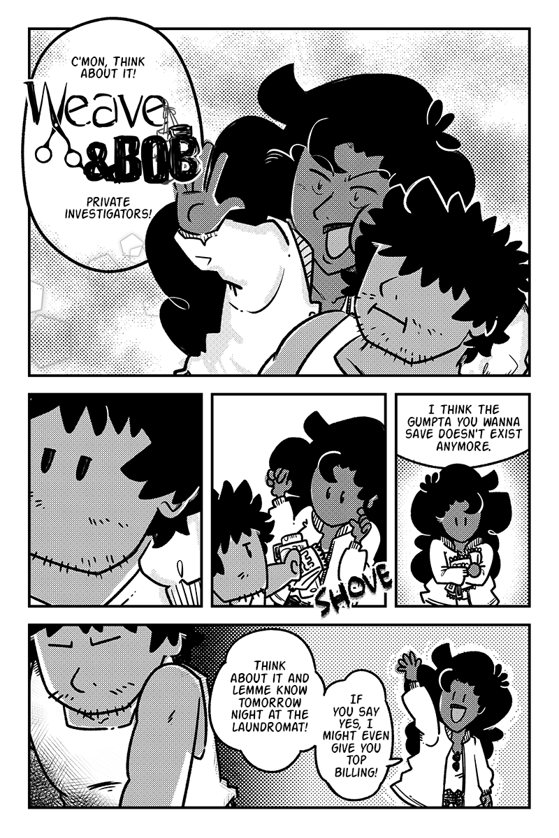 Bob and Weave are the best detectives the Gumpta Islands have to offer. Too bad they're deductive prowess is second only to their dysfunctional relationship. Following a case gone wrong, the semi-defunct agency tries to get through their day-to-day separately. If only they would stop running into each other...