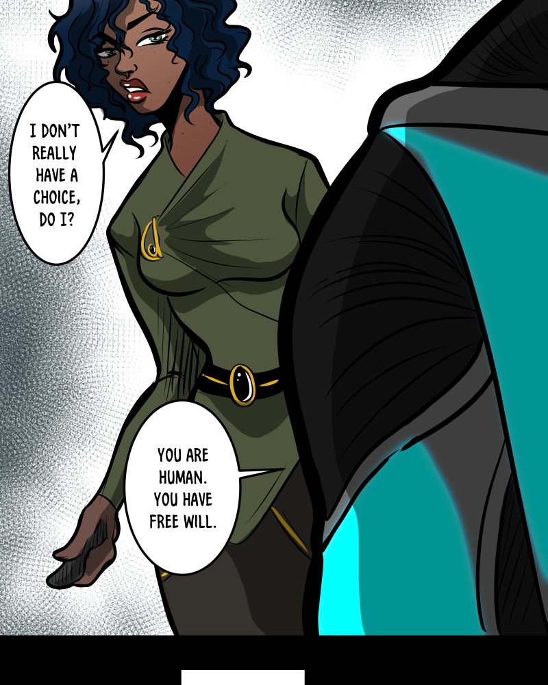 Going back to my theory on the previous page: “You are human. You have free will” “So it would seem.” The free will part? Or the human part? Or both?