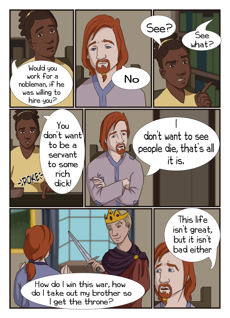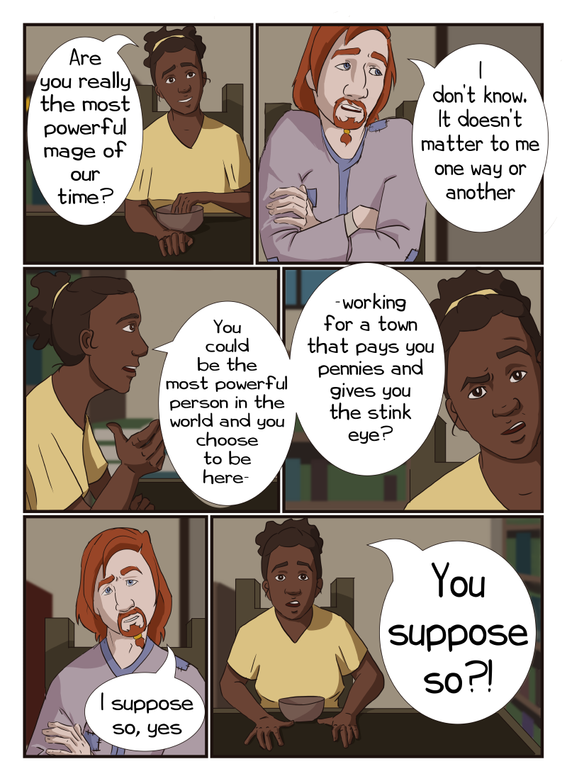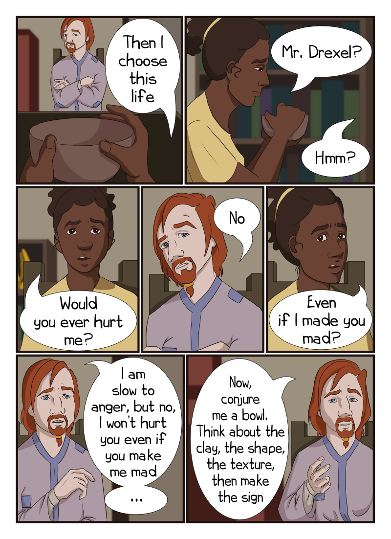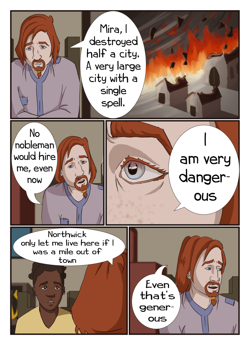 With patchy robes and concealing spells, no one would guess a small town's hermit, Drexel, to be the most powerful wizard who destroyed a large part of Resultum 23 years ago. Instead, he's more of a boogie man in Northwick. So he is surprised to meet Mira, a young woman who stubbornly wants to be his apprentice. He is more surprised to met Archimedes, a fortune teller with an easy, charming smile and a gift for seeing people. Will Drexel find healing and hope? Updates every other Monday. (themes of mental health issues)