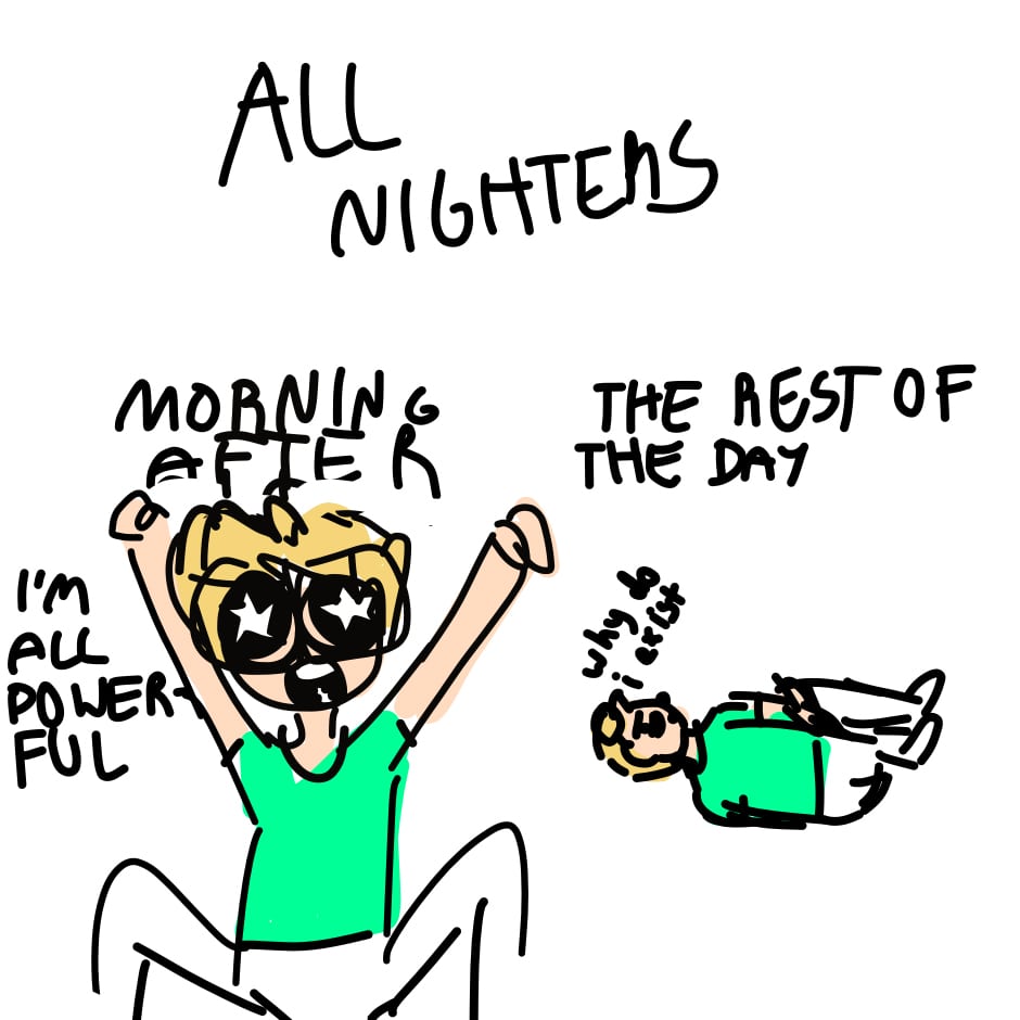 am I pulling an all nighter? Yes. Am I procrastinating by making this comic? Yes. Should I get back to work? Probably.