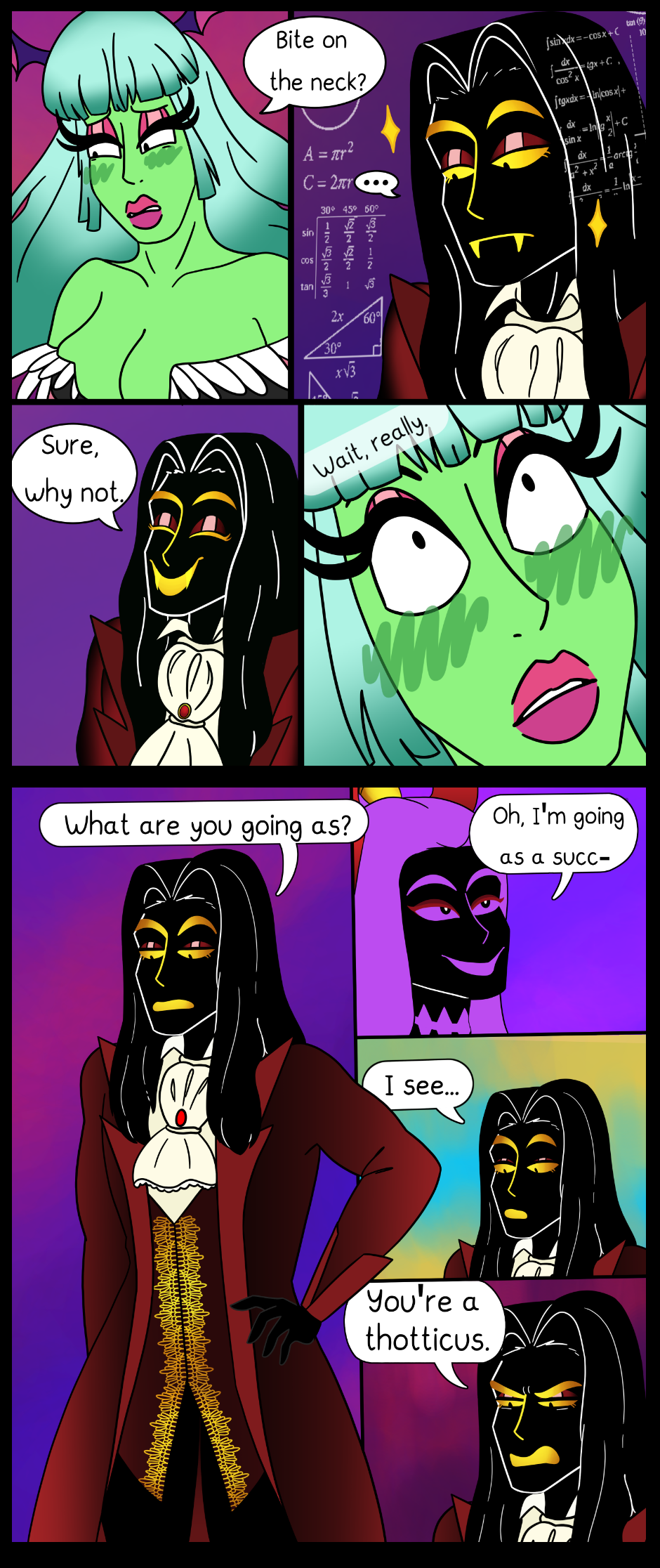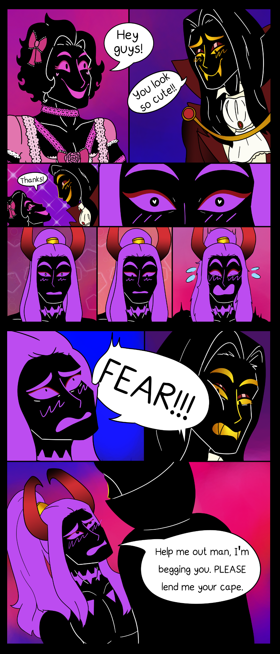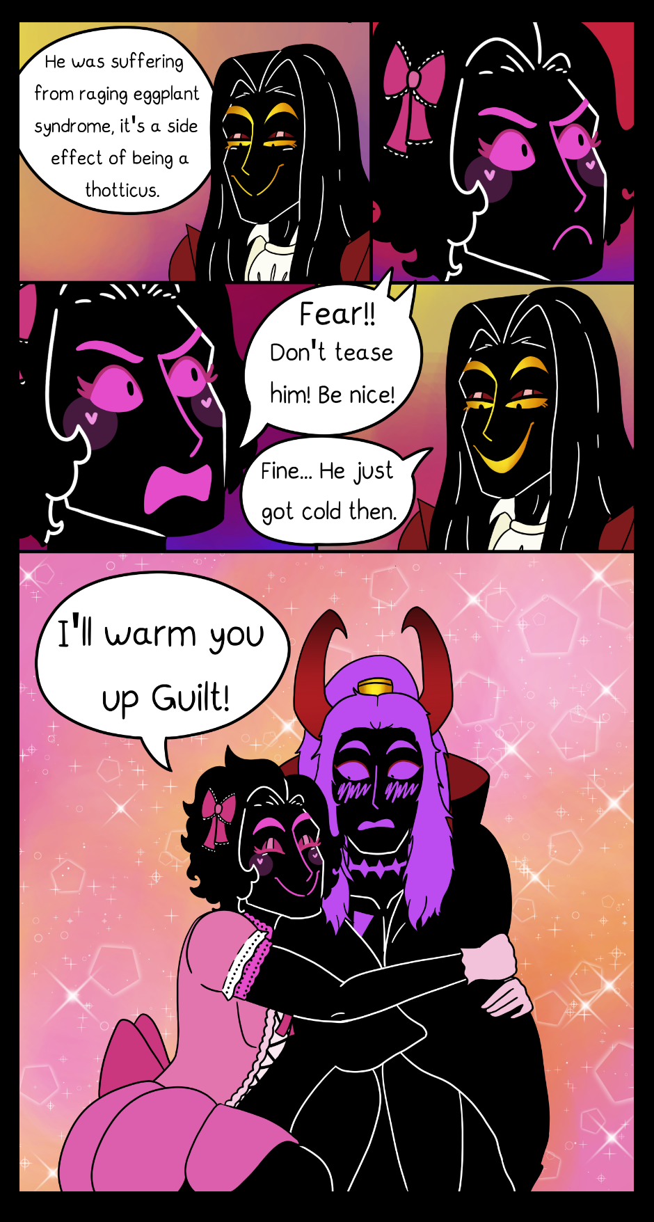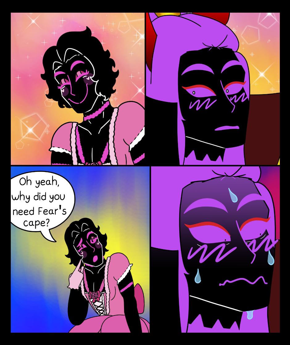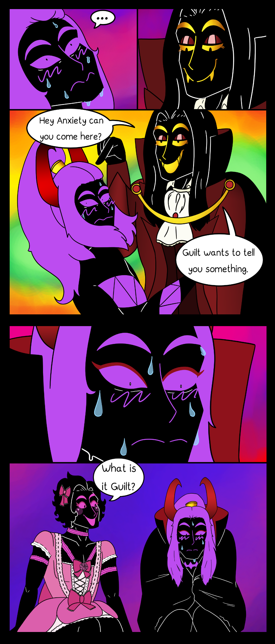 Before we saw everyones halloween costumes, now you get to see them interacting with each other! Also, Guilt has a crush on Anxiety, even though he's normally calm and composed he absolutely looses it when it comes to Anxiety.