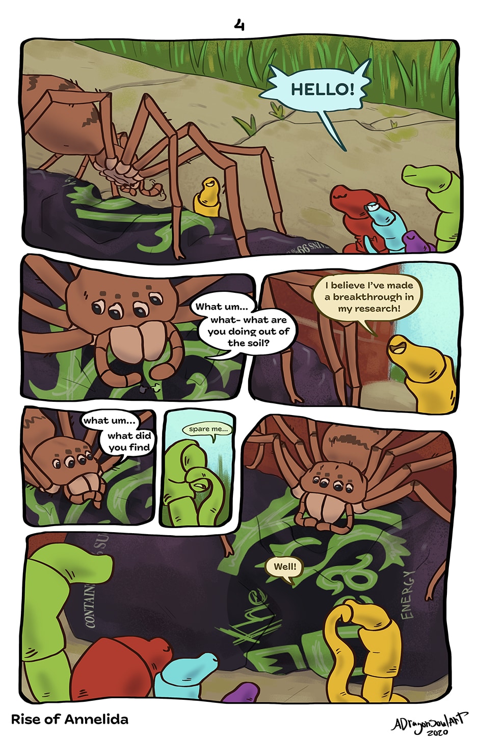 Rise of Annelida contains Spider and Insect characters, they are depicted in a cartoony and friendly way inline with the comic's style.