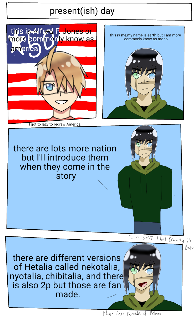 Its a fan made story about a fan made character named earth or as uaslly called mono and he lives with America and uaslly is found with China (DISCLAIMER I DON'T OWN HETALIA OR THE CHARACTERS. HETALIA BELONGS TO HIDEKAZ HIMARUYA AND ITS PUBLISHERS) now thats out of the way enjoy