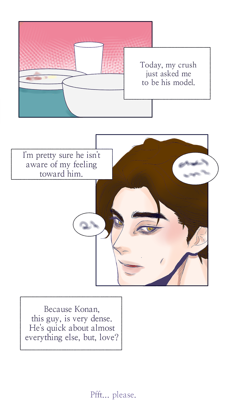 When Juno moved out from his dorm room into his own apartment studio, he knew the stupidly honest and dense guy next door, Konan, was his type. One day Konan asked him to be his model for his art project. A story of their daily struggle.