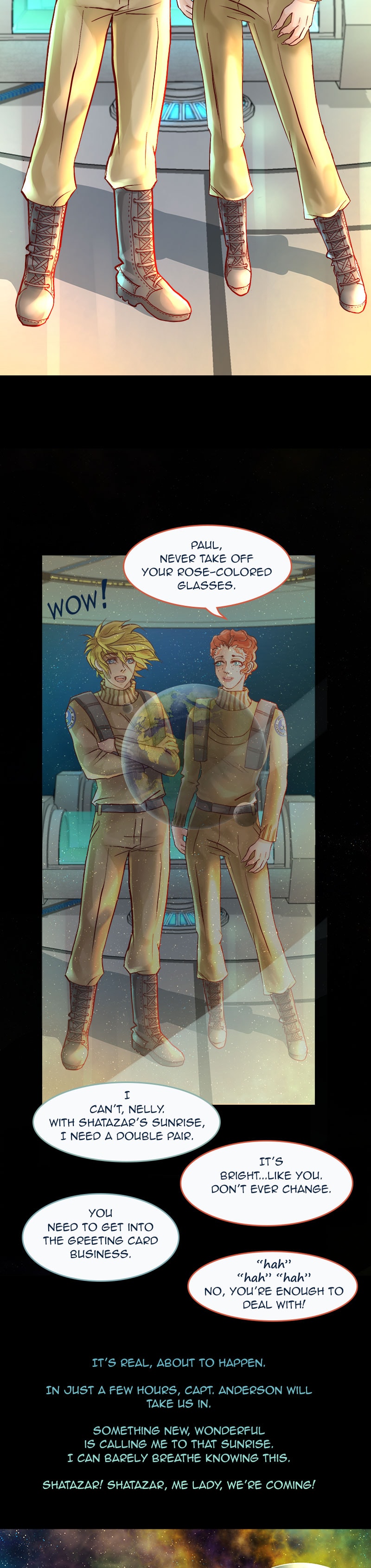 I love the season finale. Wonderful ending to the first season. I really like the scene with Paul and Nelly. Paul and Nelly show how much they care for each other. I feel nervous for Paul and Nelly in the previous scenes. Glad that they aren't so badly injured. The drawings of the characters and the aliens all look amazing. Also, the drawings of the space looks beautiful. Great episode 💕💕 congrats to a wonderful season finale 💖