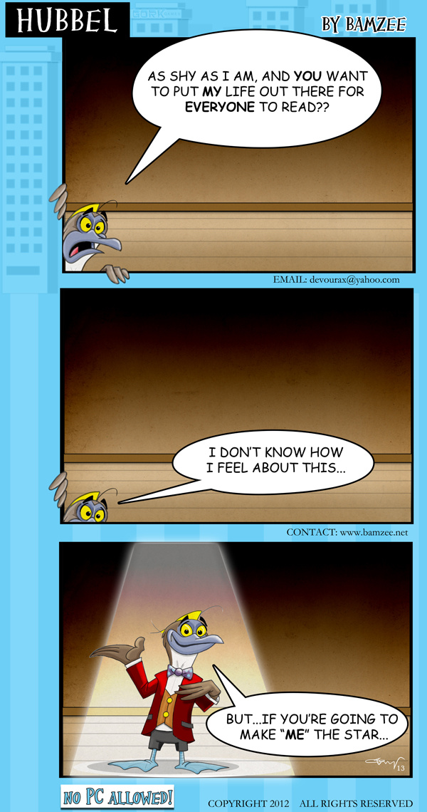 "Hubbel" is a daily webcomic about Bill Hubbel, a blue footed booby who works for a game company called, Gork Games.