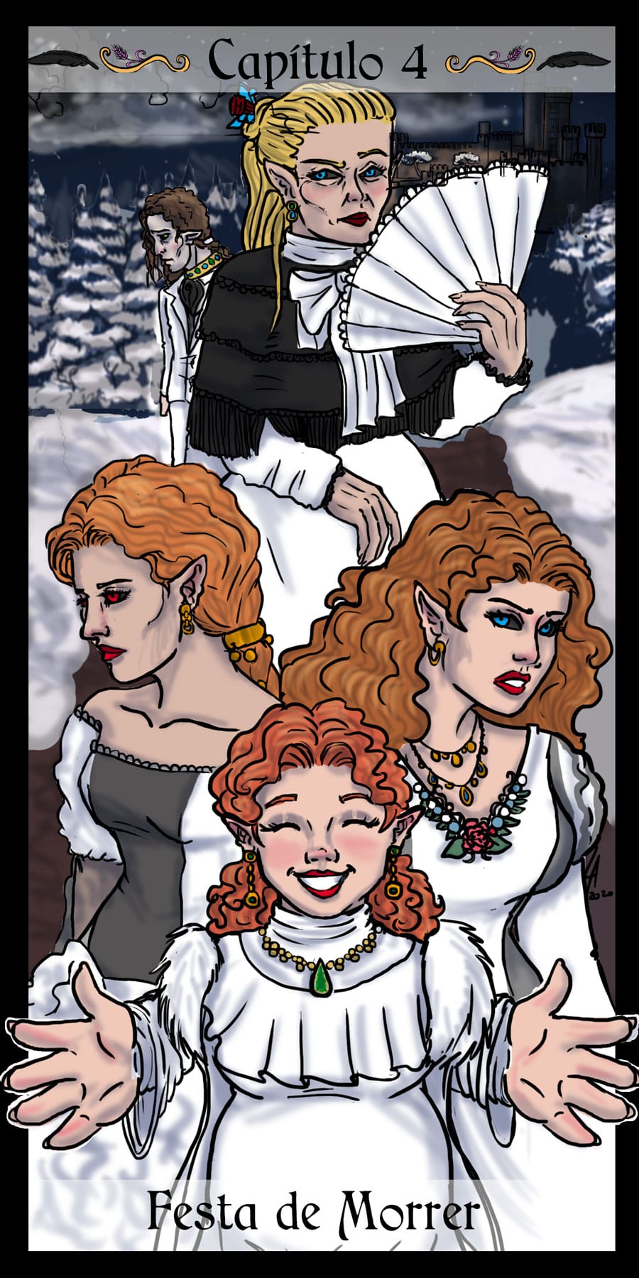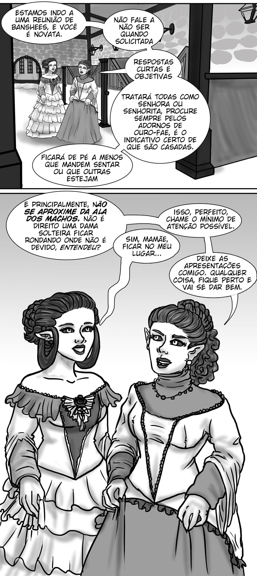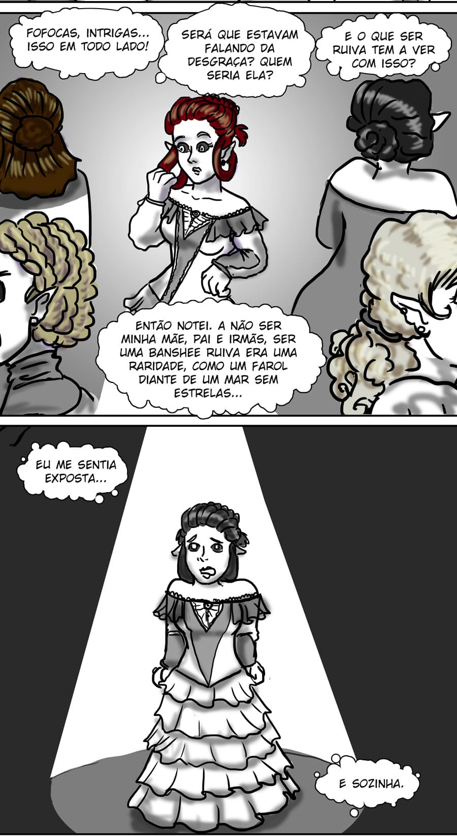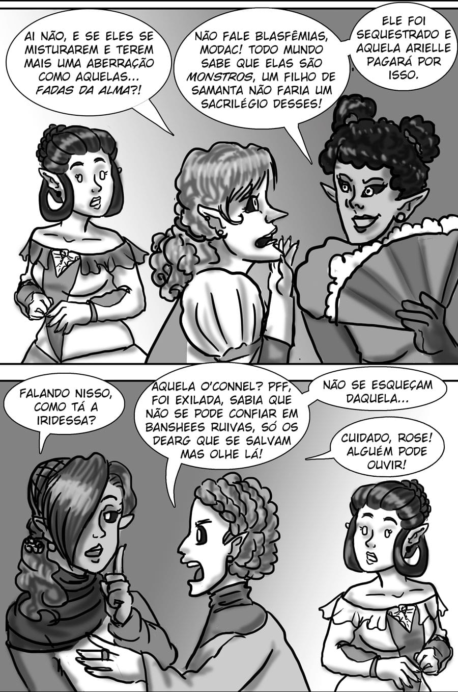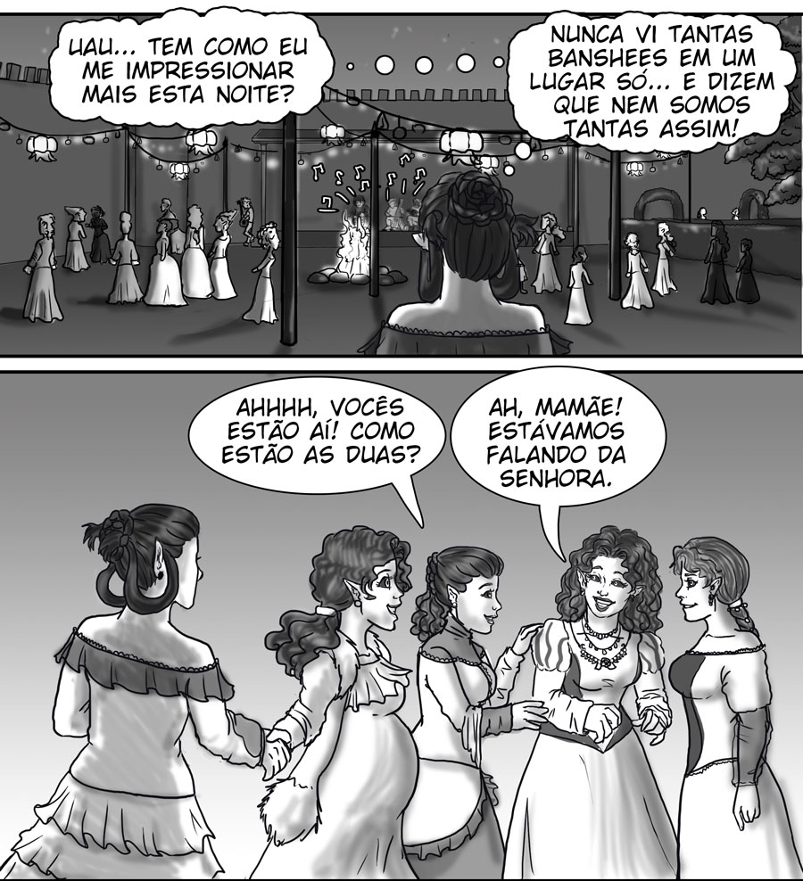 Esse diálogo entre as irmãs foi muito bom. Expôs uma informação do mundo (a idade plena das banshes) de uma forma nem um pouco expositiva, muito bem feito. Sobre outro ponto, eu acho muito bizarro como elas tratam a si mesmas como um tipo de produto. A irmã de Delma provavelmente só queria um garoto porque isso a ajudaria em alguns aspectos, como uma barganha. E esse foi mais um capítulo que mostra como é difícil ser homem 😭😭 kk. As pulseiras/grilhões, o garoto que foi "sequestrado", e também esse racismo por parte delas. Me lembra da governanta da casa de Edna, eu tinha pressuposto que esse tipo de espécie sofresse racismo, mas não tinha base alguma senão a posição dela na casa, mas esse capítulo meio que confirmou, né?
