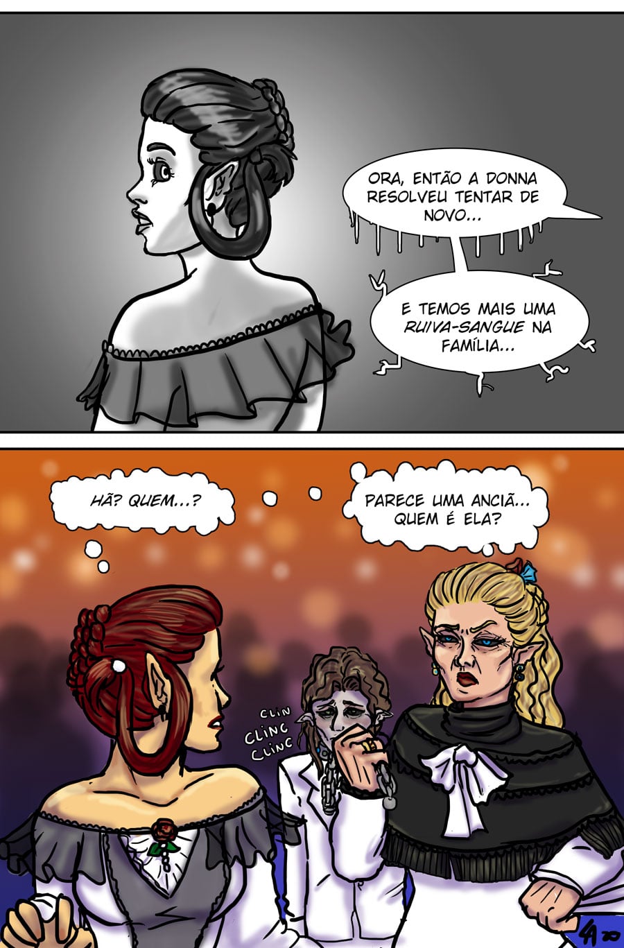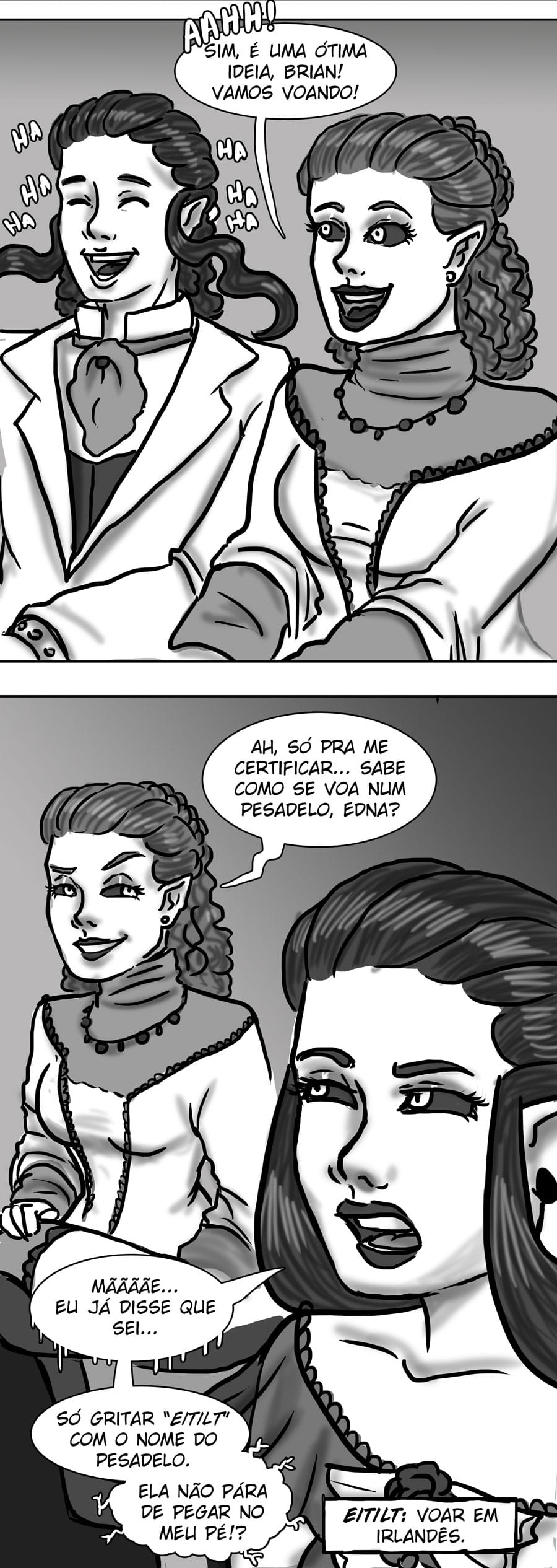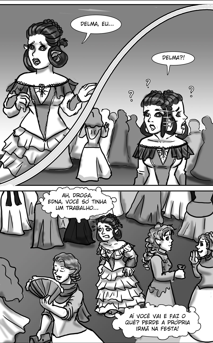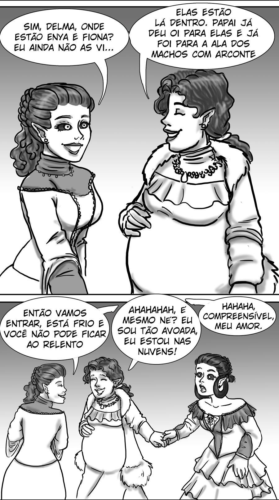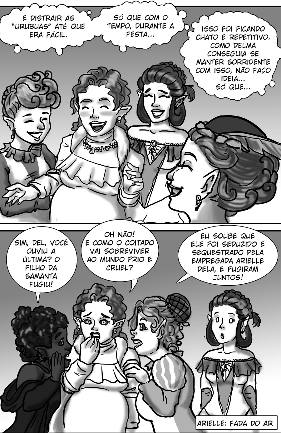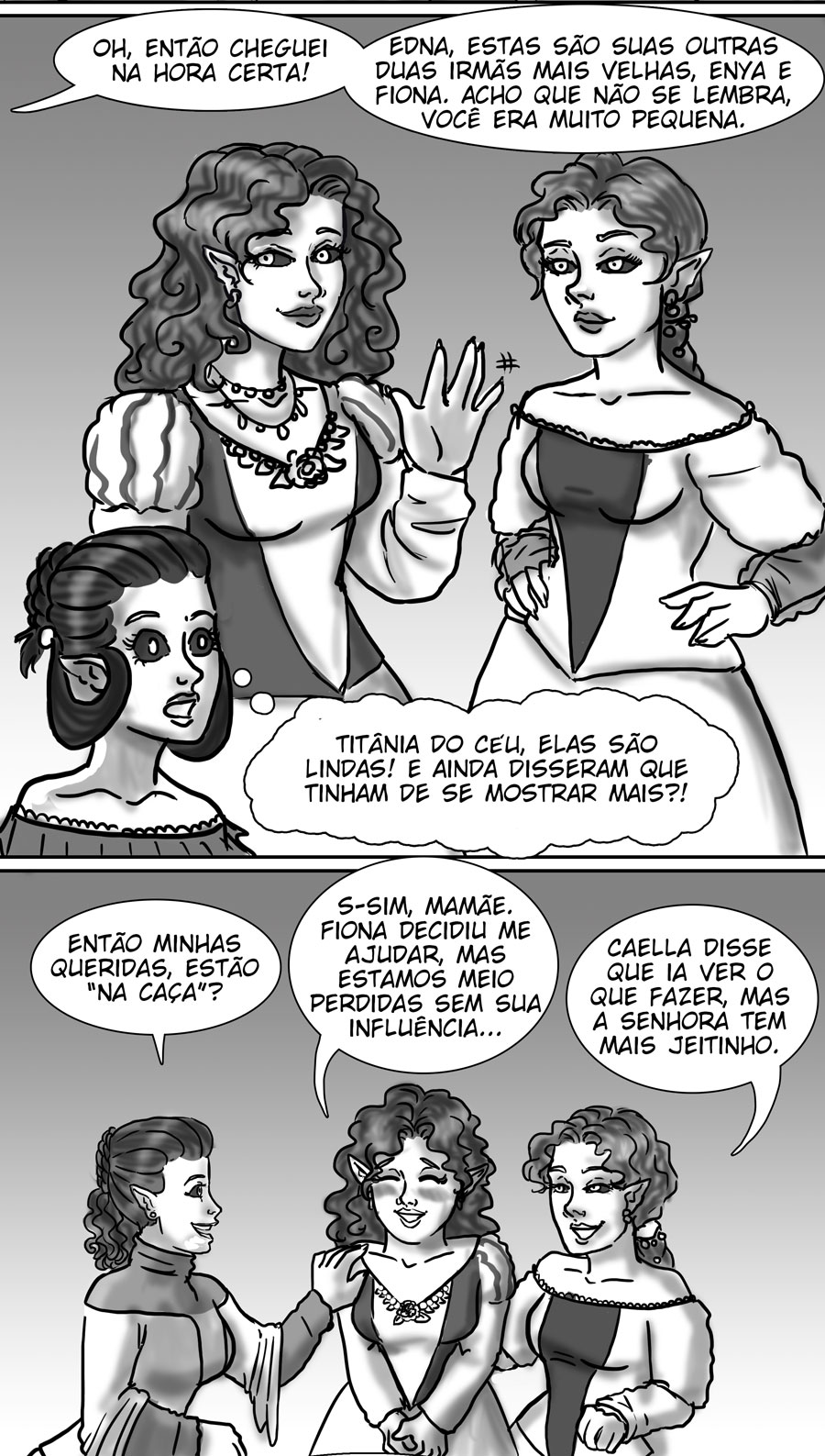 Esse diálogo entre as irmãs foi muito bom. Expôs uma informação do mundo (a idade plena das banshes) de uma forma nem um pouco expositiva, muito bem feito. Sobre outro ponto, eu acho muito bizarro como elas tratam a si mesmas como um tipo de produto. A irmã de Delma provavelmente só queria um garoto porque isso a ajudaria em alguns aspectos, como uma barganha. E esse foi mais um capítulo que mostra como é difícil ser homem 😭😭 kk. As pulseiras/grilhões, o garoto que foi "sequestrado", e também esse racismo por parte delas. Me lembra da governanta da casa de Edna, eu tinha pressuposto que esse tipo de espécie sofresse racismo, mas não tinha base alguma senão a posição dela na casa, mas esse capítulo meio que confirmou, né?