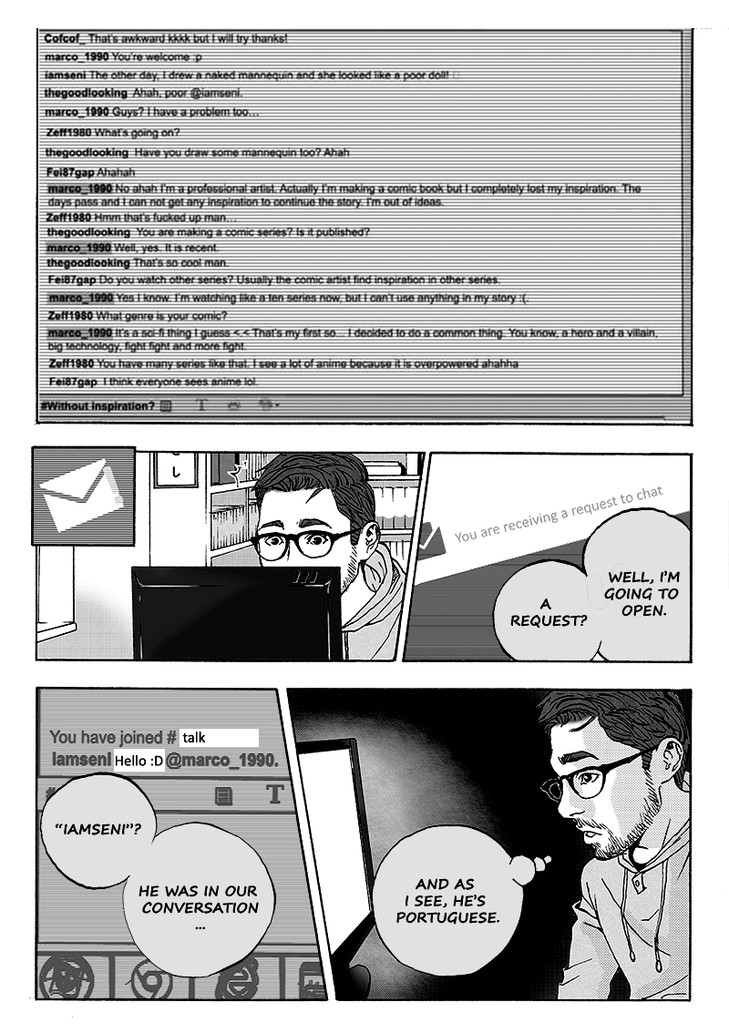 "Perfect Team" is a series that I've created when I was passing for a long inspiration crisis. This story is about a portuguese immigrant in USA. Marco is a comic book creator and he is passing for a lack of inspiration. Fortunately he will meet a young girl with a big dream. Together they will help each other to find their inspiration.