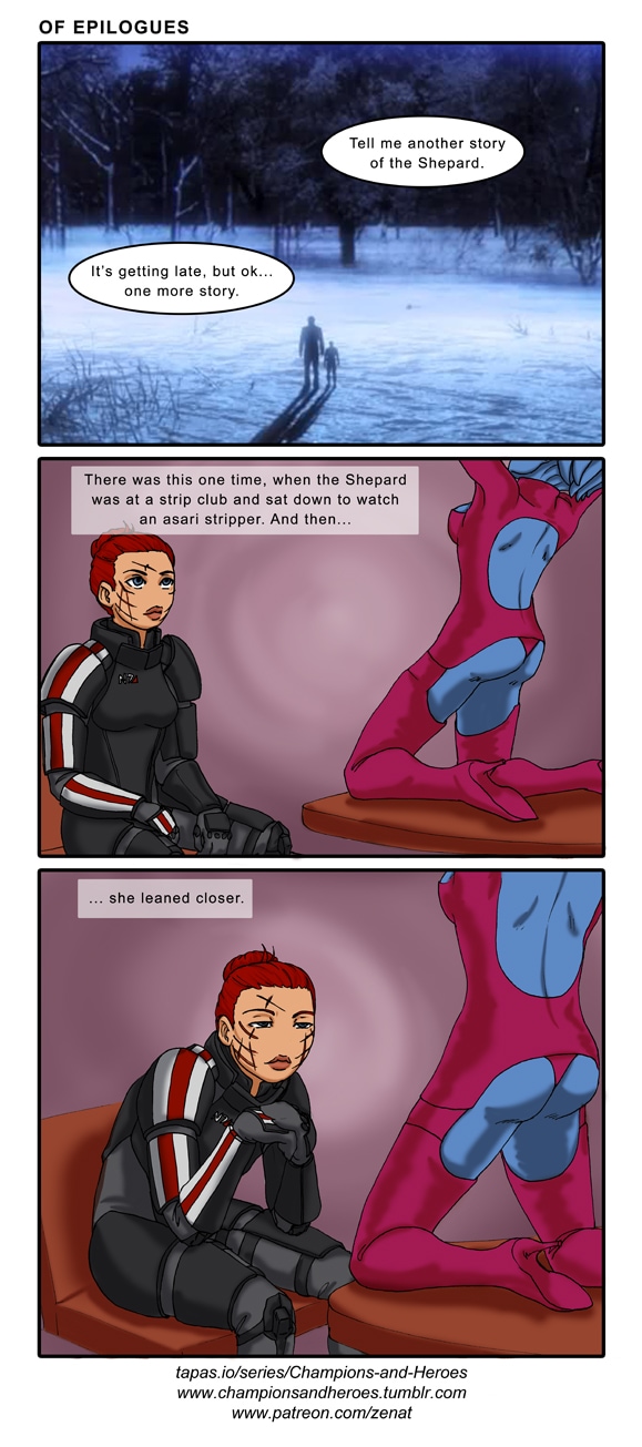 All I could think when I got to that part was 'really? Is the stargazer telling his grandchild about *everything* Shepard ever did? Even the bit where she wandered into the men's bathroom for the eight time?' That's just bad story telling, grandpa :I