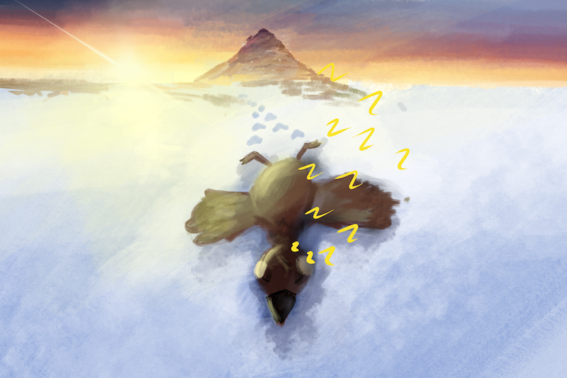 A trodden tundras tousled terrain, Cease with the fallen in the snow, Bearings left behind and lost homeward headings, A goose knows not where she will go.
