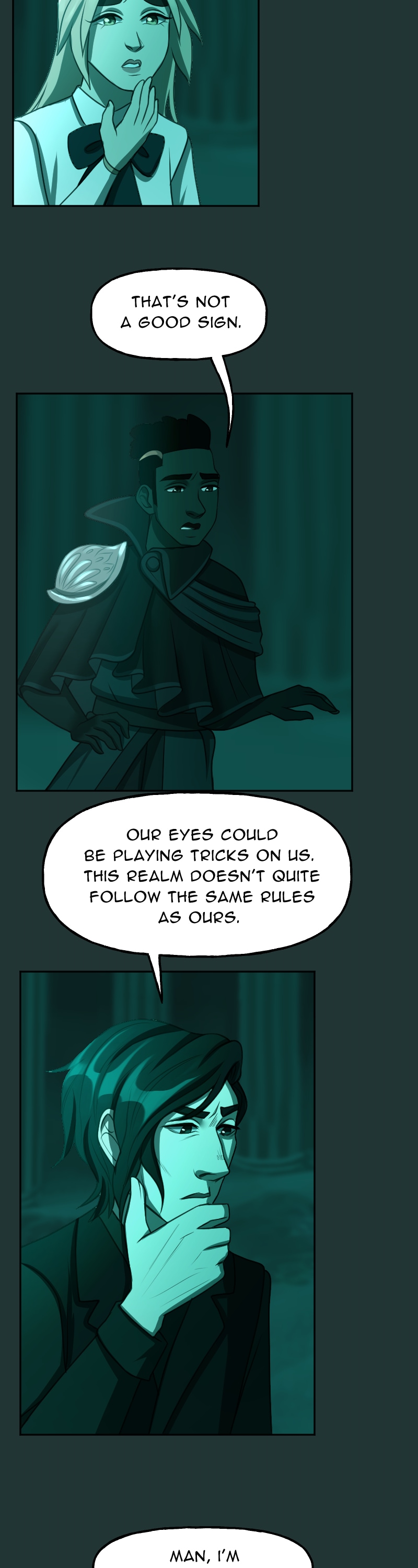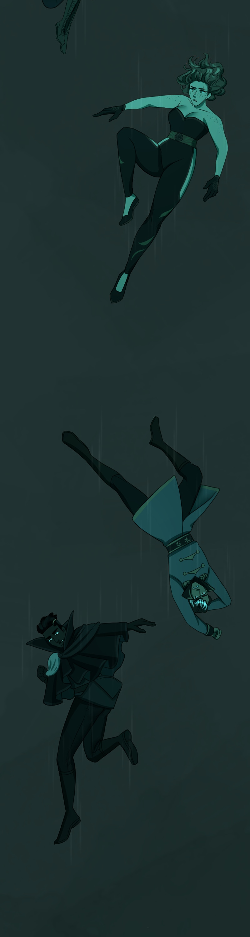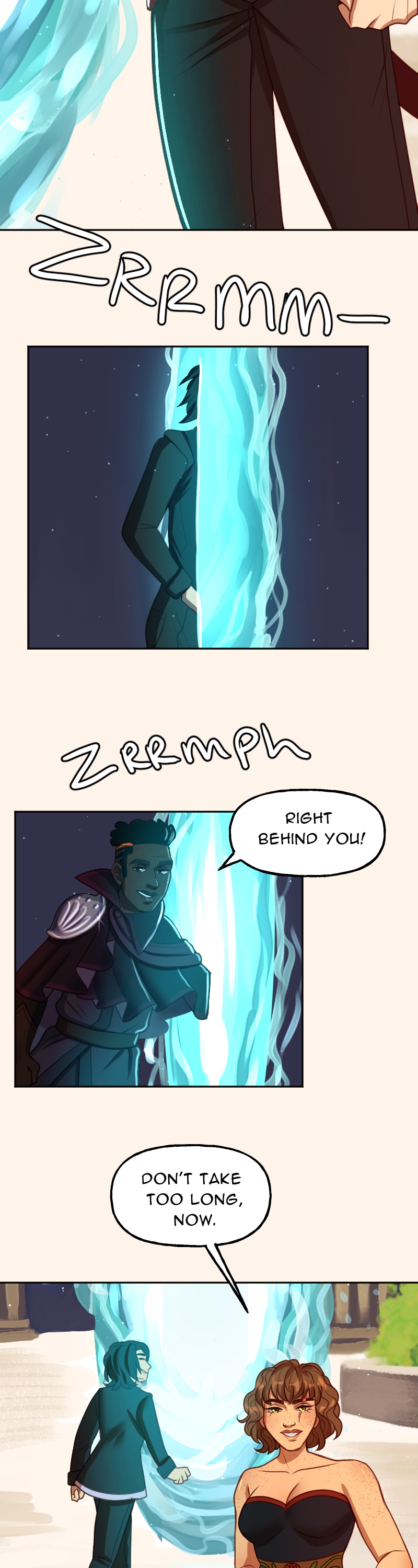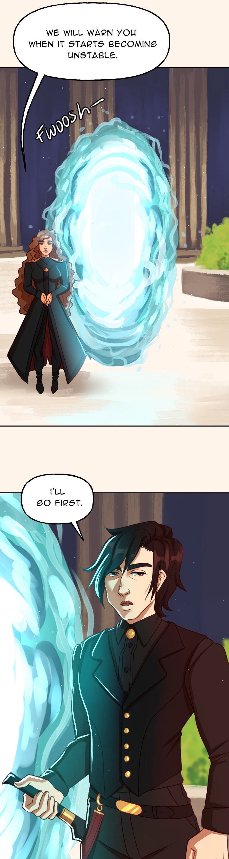 I just can't get over how good the art is and how much I like this art style. And the DESIGNS- they're so stunning, it's too much. I can't handle such utter perfection. And the way the color scheme completely changes when they go through the rift really sets the mood. I love this comic so much and I'm very excited to read more.(sorry long comment)