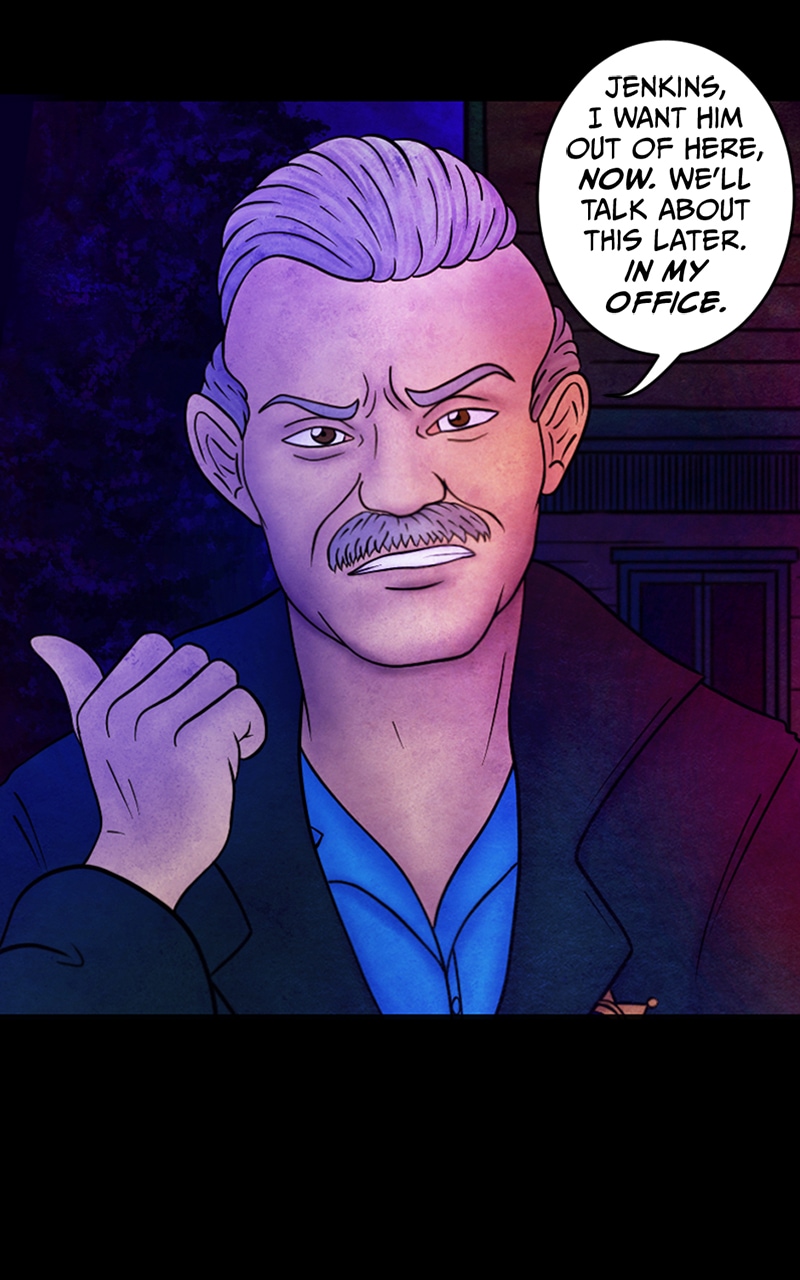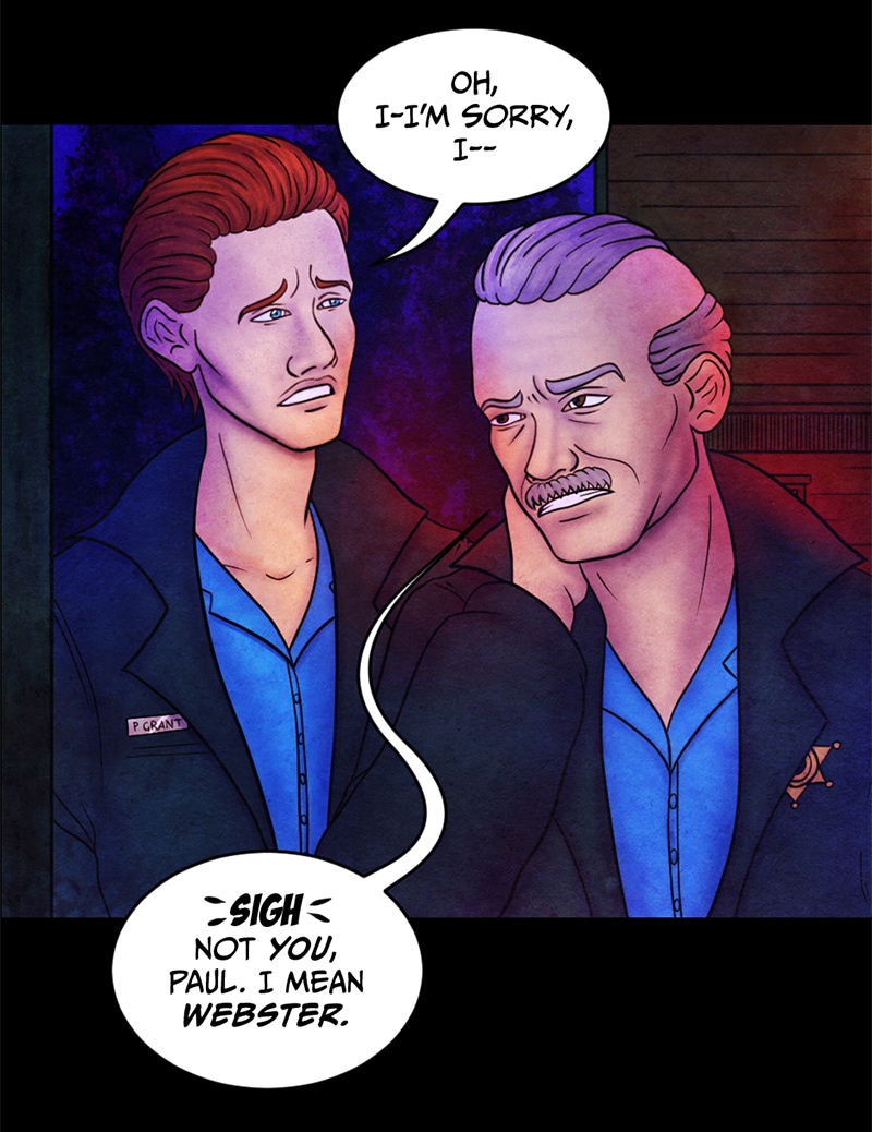 "Oh, I-I'm sorry, I--" officer Paul Grant tries to justify himself, embarassed, but Sheriff Crawford interrupts him with a sigh: "Not you, Paul, I mean Webster" he raises his hand and points outside with his thumb "Jenkins, I want him out of here, now. We'll talk about this later. In my office."