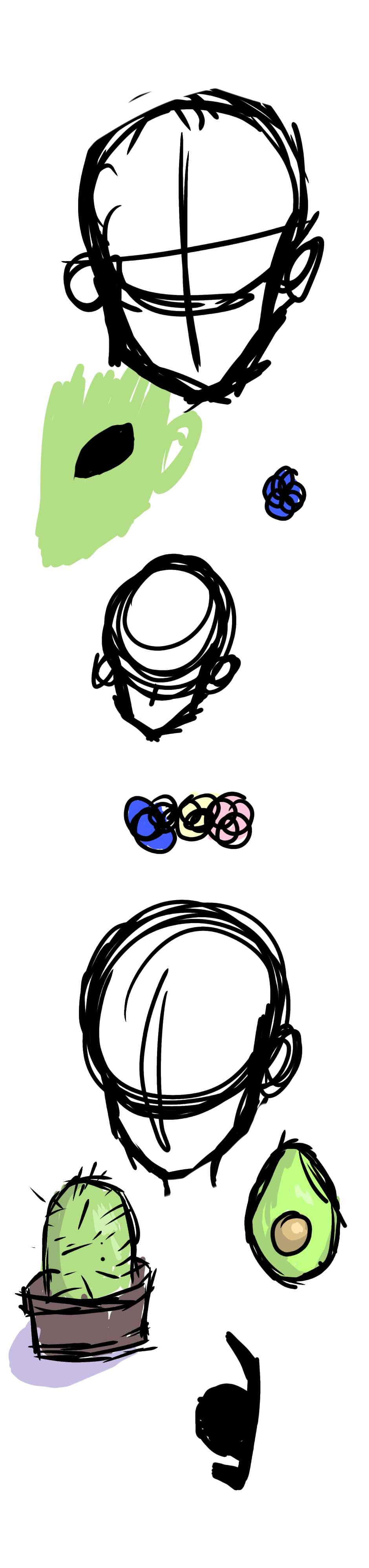 I've been unsatisfied with my art recently and have been trying to find a style I like. Here it's product (kinda) also I'm realizing I really like green stuff lol. I'm proud of the avocado and cactus tho, shading is hard for me so It was a nice touch.