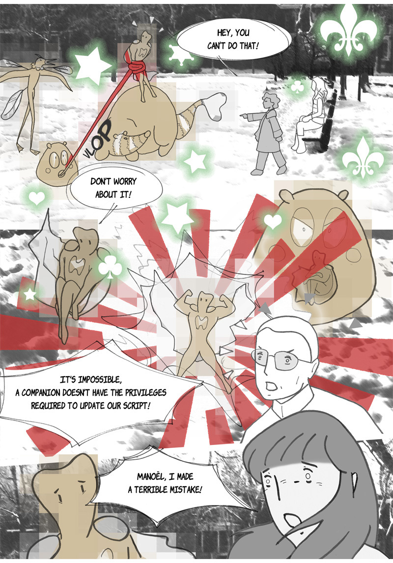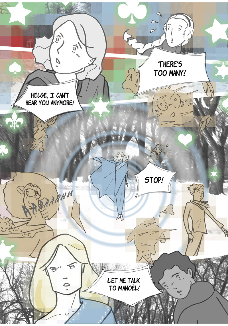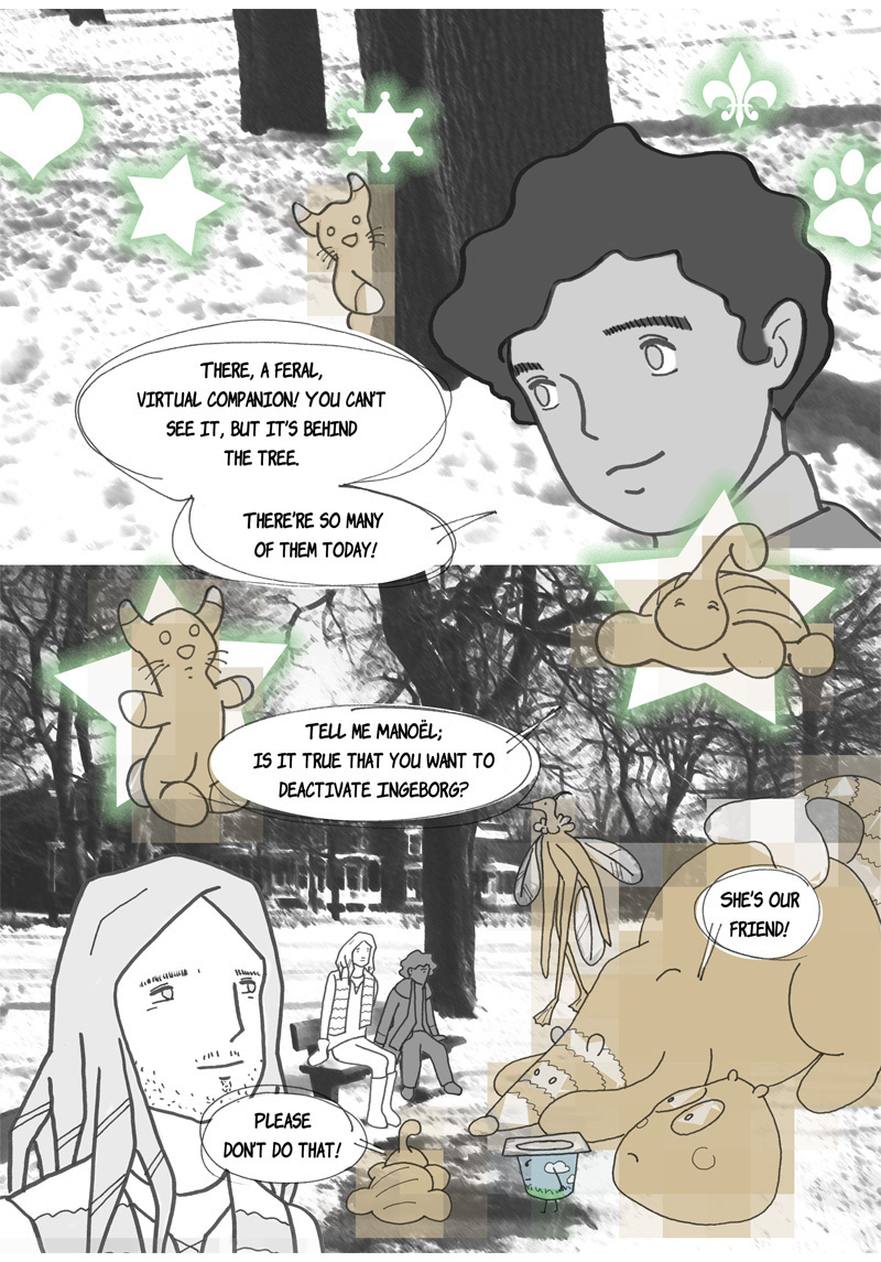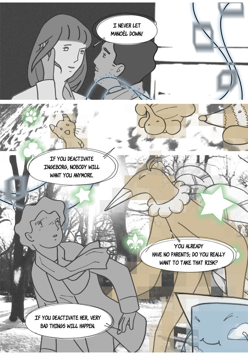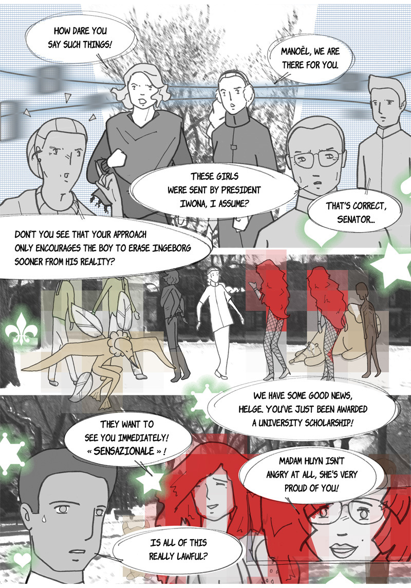“Omniscience” is a sci-fi manga. Its story is set in a hypothetical future where augmented reality has invaded our daily lives, thanks to contact lenses superimposing virtual characters into reality. One of these characters, Ingeborg, is particularly popular; she is like a second mother for generations of children, devoted and insightful. She is, however, disavowed by more and more of her subscribers – authorities suspecting her of being more harmful than beneficial to their well-being. This is what two teenagers are going to discover when they help a young fellow from their boarding school to find his parents, who abandoned him a few years earlier for an unknown reason…