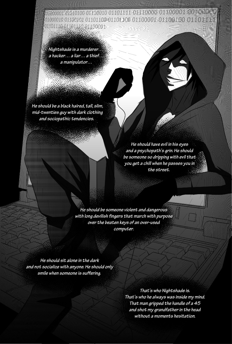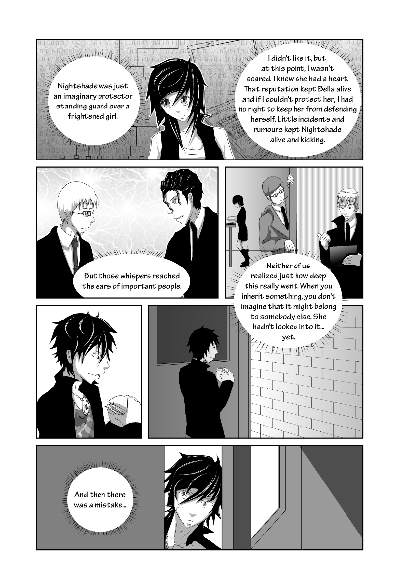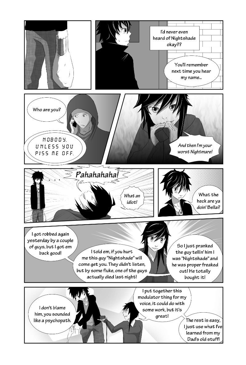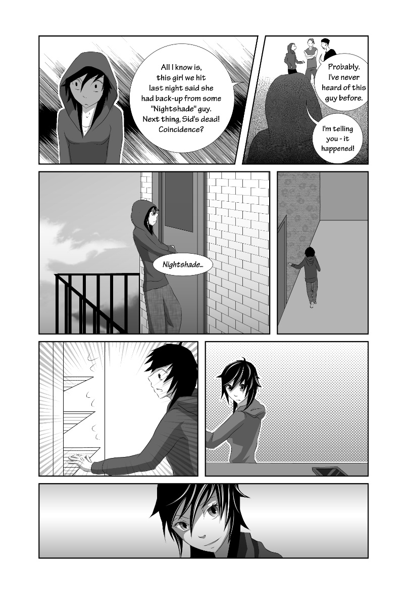 Nightshade is a shonen-mystery-style series, full of twists & turns with a light-hearted comedy side to contrast! The story is kicked into action by Oliver Sloane as he sets out to uncover the identity of the deadly anonymous hacker known as "Nightshade". Uptown-resident Oliver recruits his Downtown friend "Bella" and ventures out to meet with an established team committed to the unmasking of Nightshade. There'll be a new chapter every MONDAY!