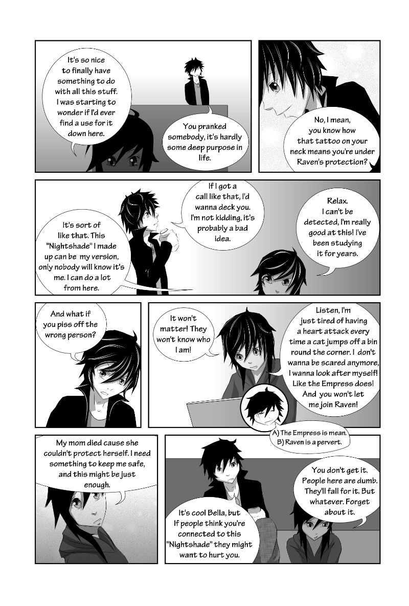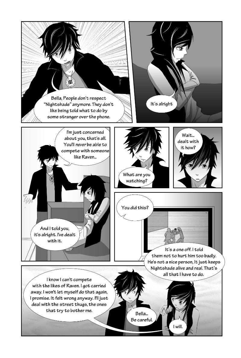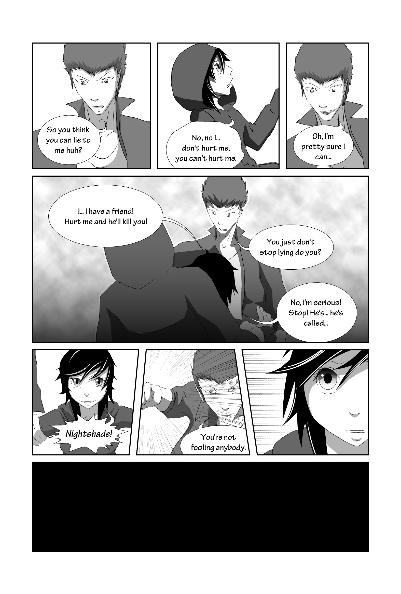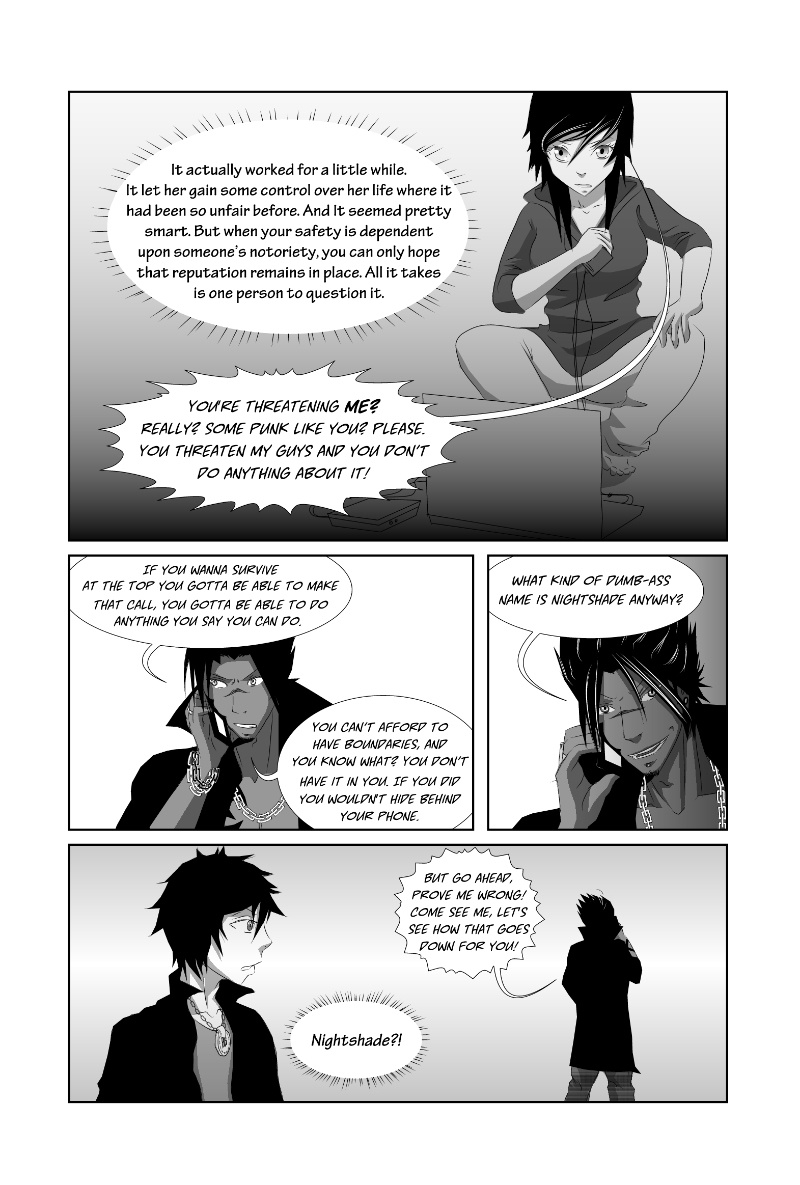 Nightshade is a shonen-mystery-style series, full of twists & turns with a light-hearted comedy side to contrast! The story is kicked into action by Oliver Sloane as he sets out to uncover the identity of the deadly anonymous hacker known as "Nightshade". Uptown-resident Oliver recruits his Downtown friend "Bella" and ventures out to meet with an established team committed to the unmasking of Nightshade. There'll be a new chapter every MONDAY!