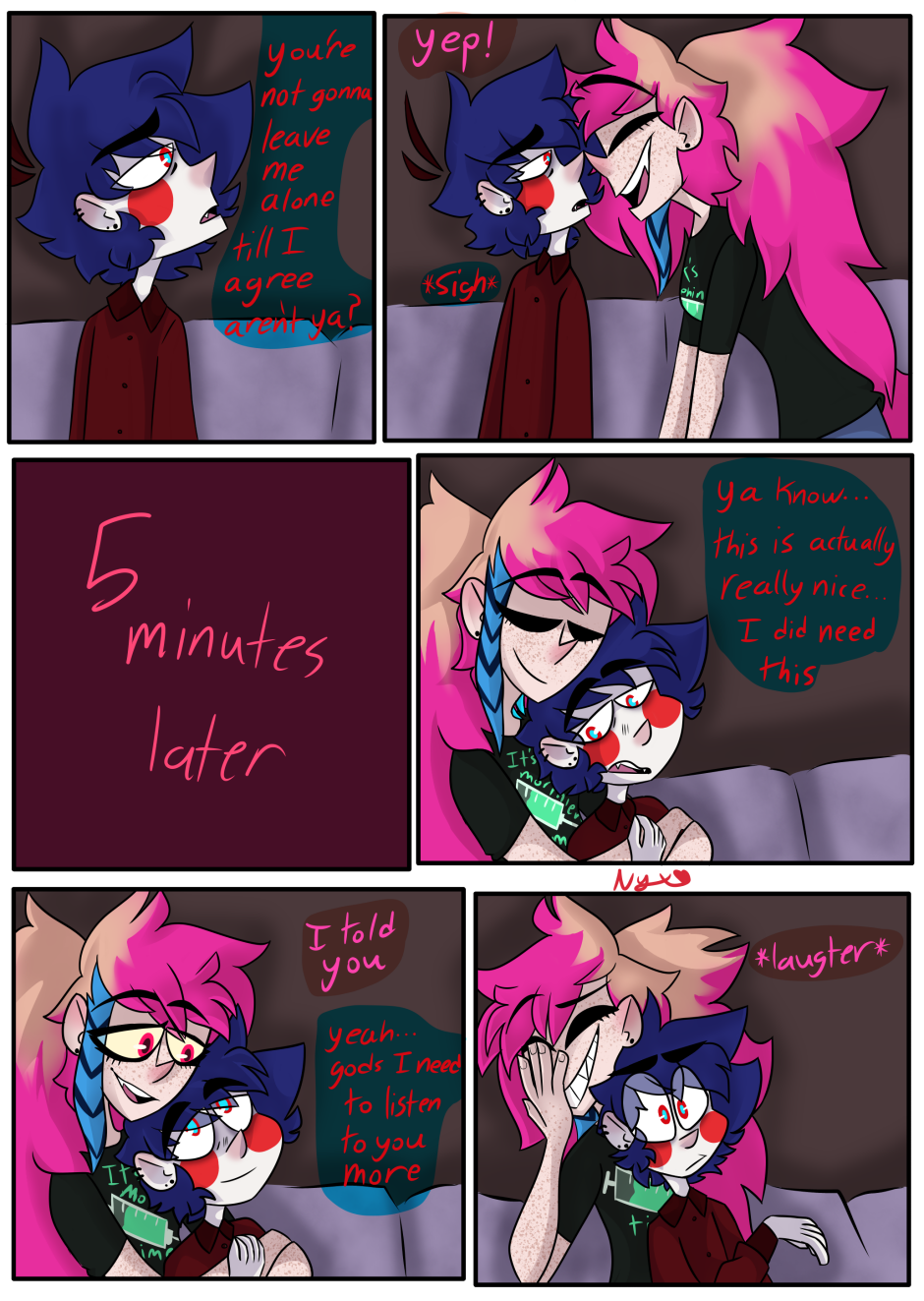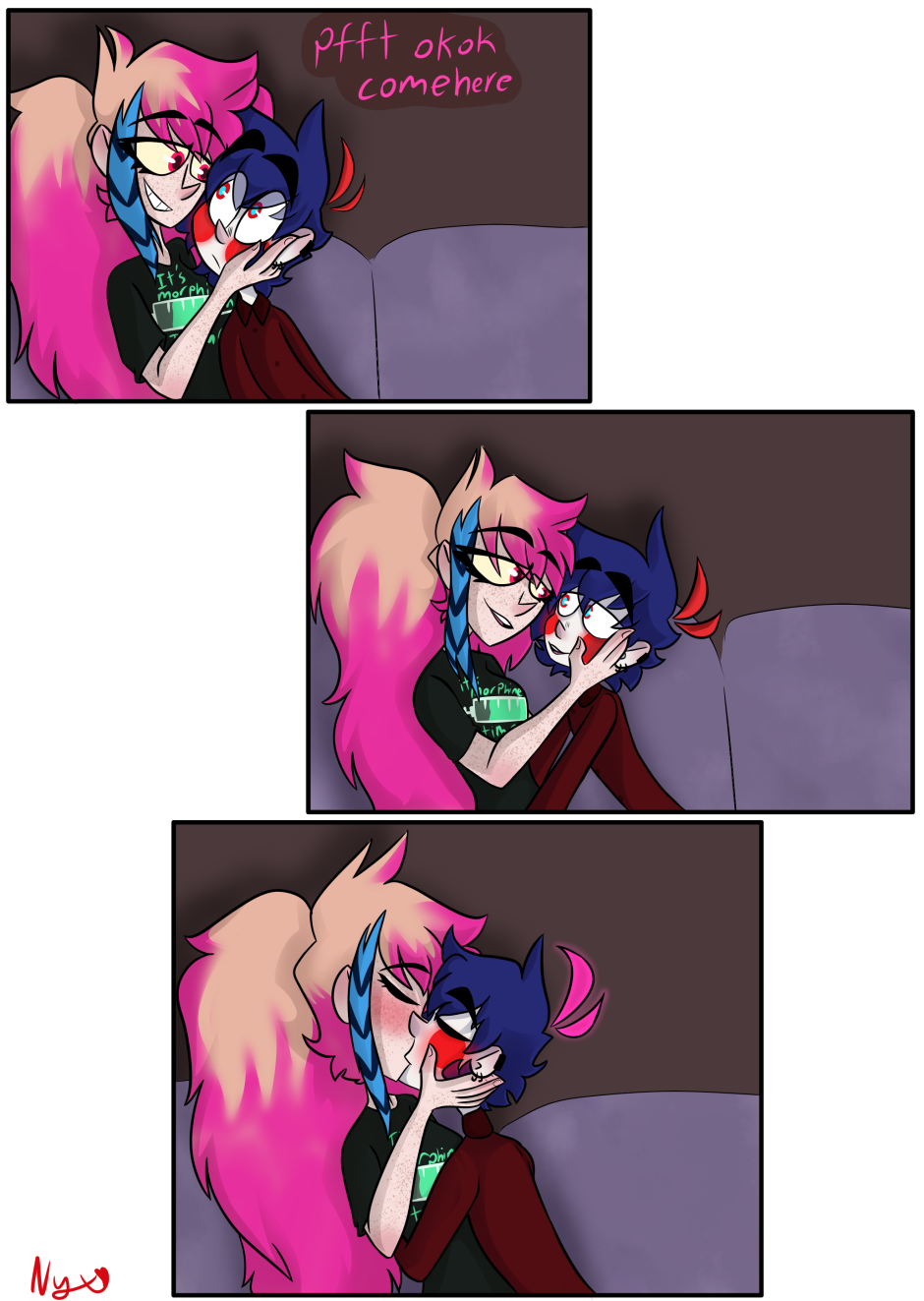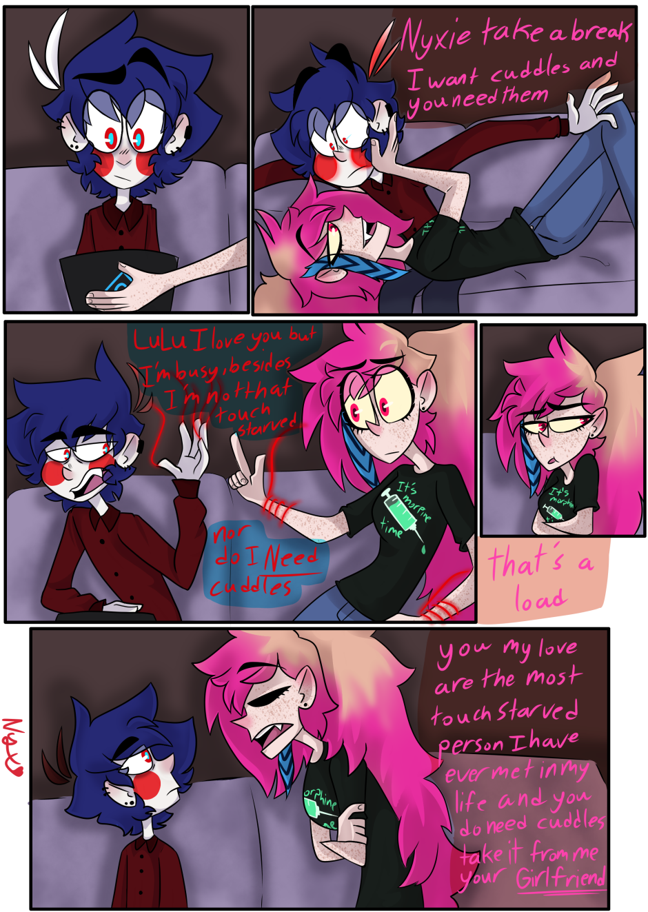 yeah they gay (I mean Lucy's wearing Nyx's shirt of course they gay) so if the first two look different they were drawn awhile before also i don't know how to shrink an image without ruining the look yet so sorry