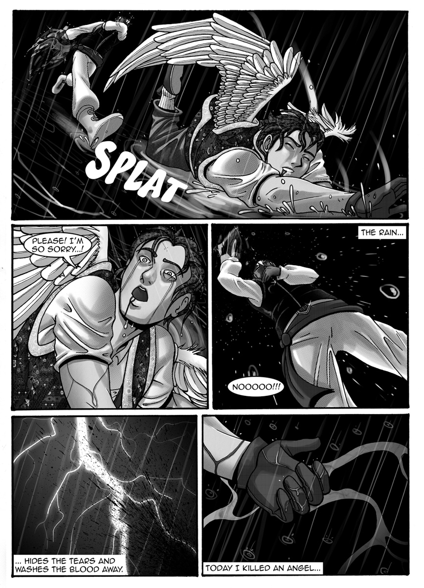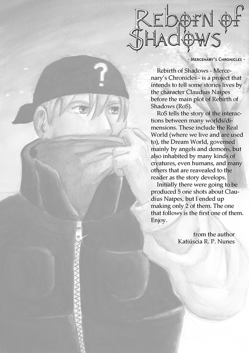 The Rebirth of Shadows story (back in the day it was mispelt as Reborn of Shadows) was created in 2003. Mercenary's Chronicles is a spin off series about the character named Claudius Naipes. He is a human mercenary in a world paralel to ours named Dream World, majorly inhabited by angels and demons, and each episode of the series depics a different mission of his. It was made in 2008, so it's not top notch quality, but I'm still proud of it. I hope you enjoy it as well!