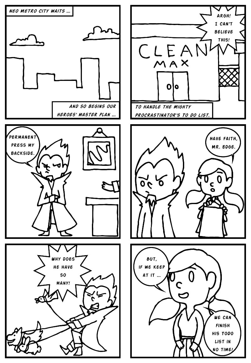 The Mighty Procrastinator, a hero who can accomplish anything ... tomorrow. Fuming at the city's savior and his lack of effort to stop the foes of here and now, Edge Lord Maverick spends the almighty dollar as he struggles to light the way for a new breed of heroes. They also might have lunch, but Procrastinator Man always forgets the sandwiches.