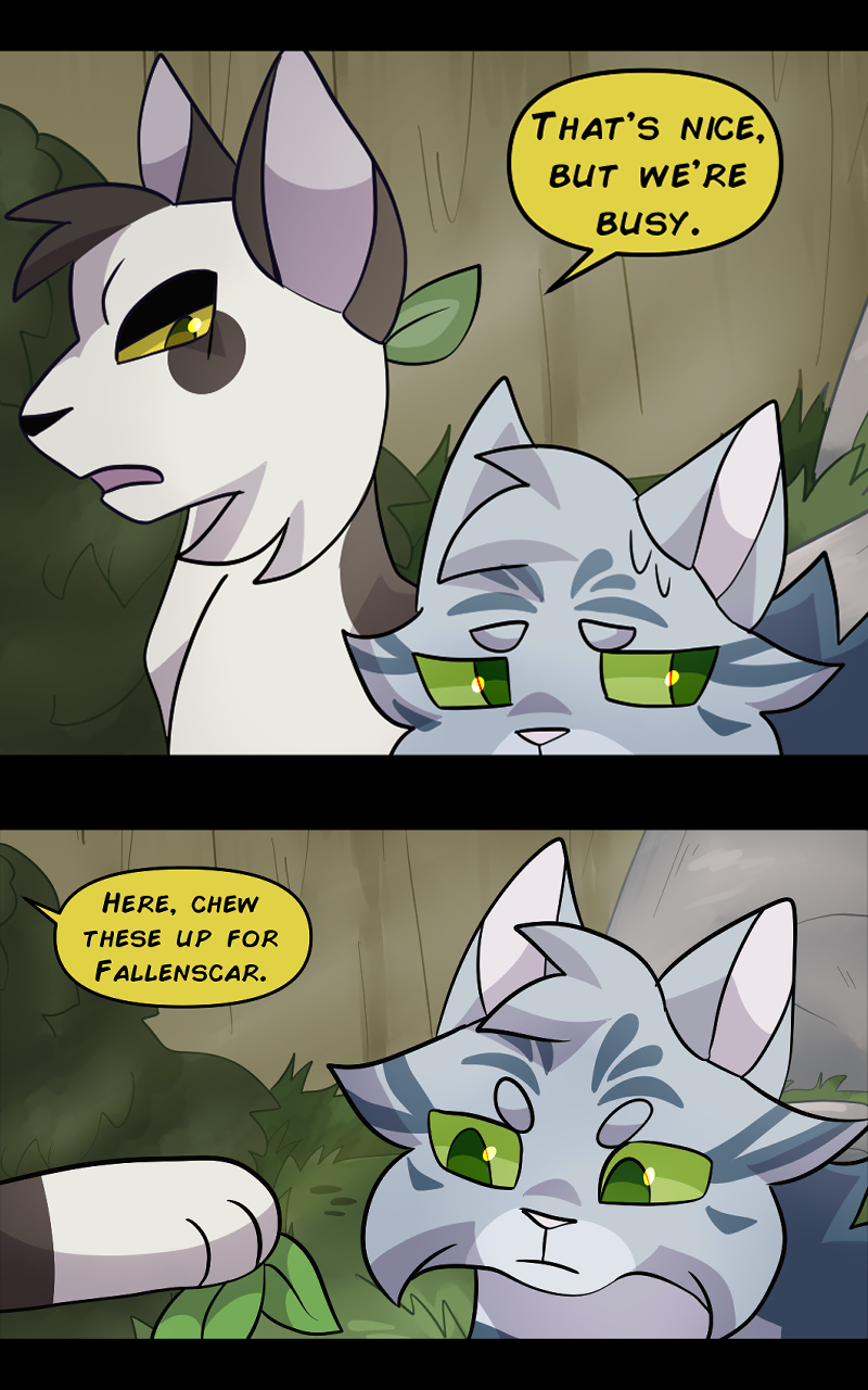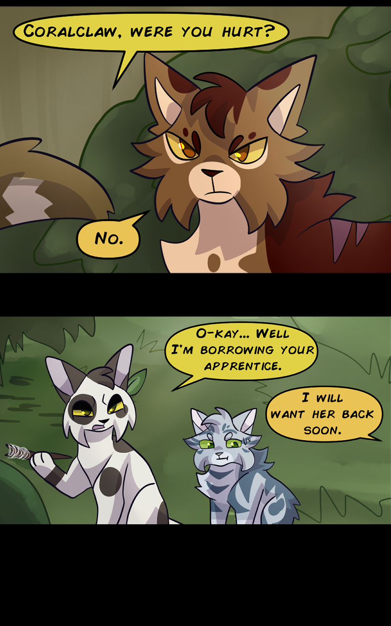 There are two clans in this setting, Oceanclan and Treeclan. Oceanclan lives near the beach, and Treeclan lives in the woods behind them. The two clans have had high tensions for many years, two new leaders made a pact for peace but issues start arising and reasons to fight keep appearing. Fishpaw is a warrior apprentice during this time, and she has her own personal struggles to deal with. Her destiny leads her down a dark path and and when a strong force of evil takes control, will Fishpaw and her friends come out on top... or will they perish?