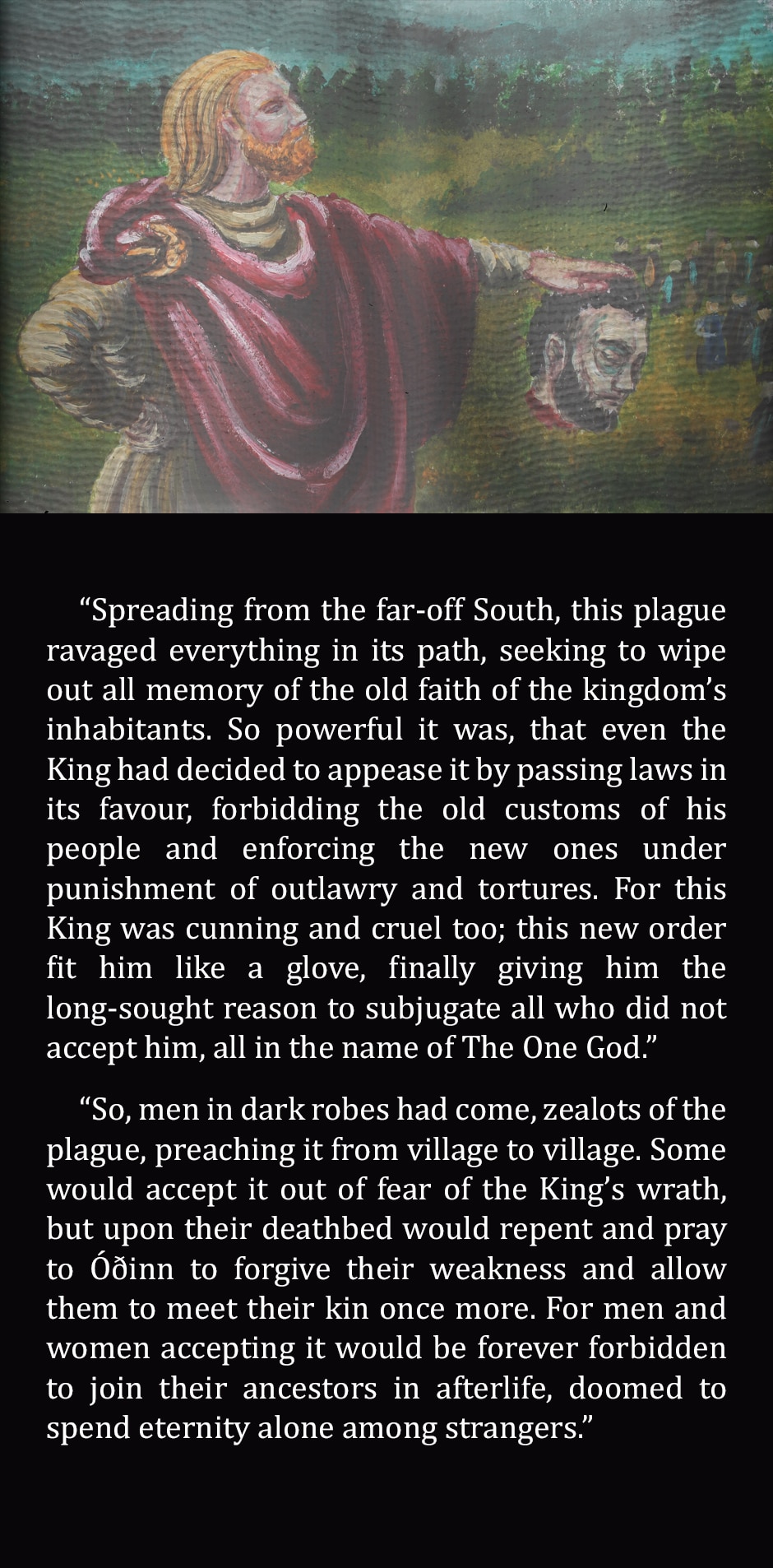 The king from the story is King Olaf Tryggvason who (quite bloodily) converted Norway and Iceland to Christianity in the last years of the 10th century. That isn't to say that his opponents are less bloody.