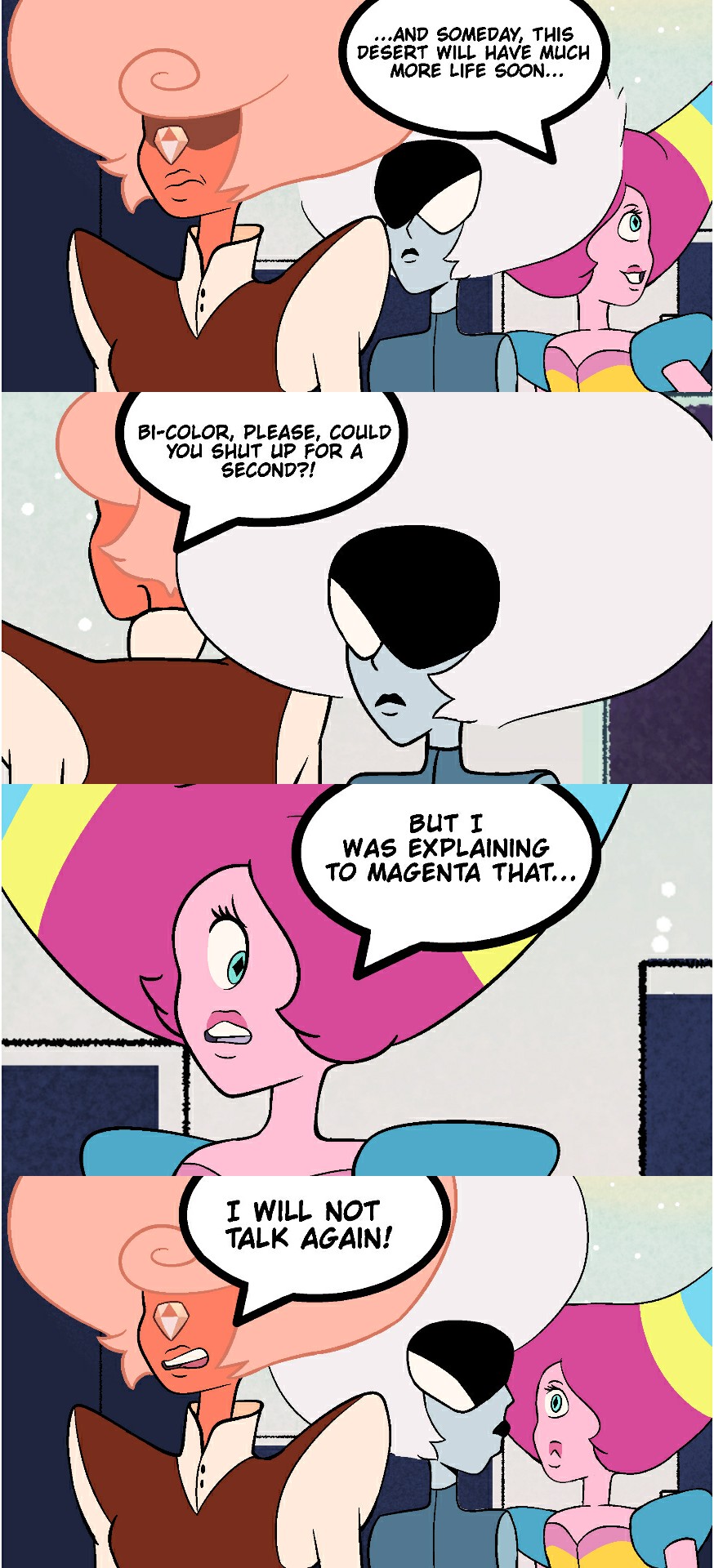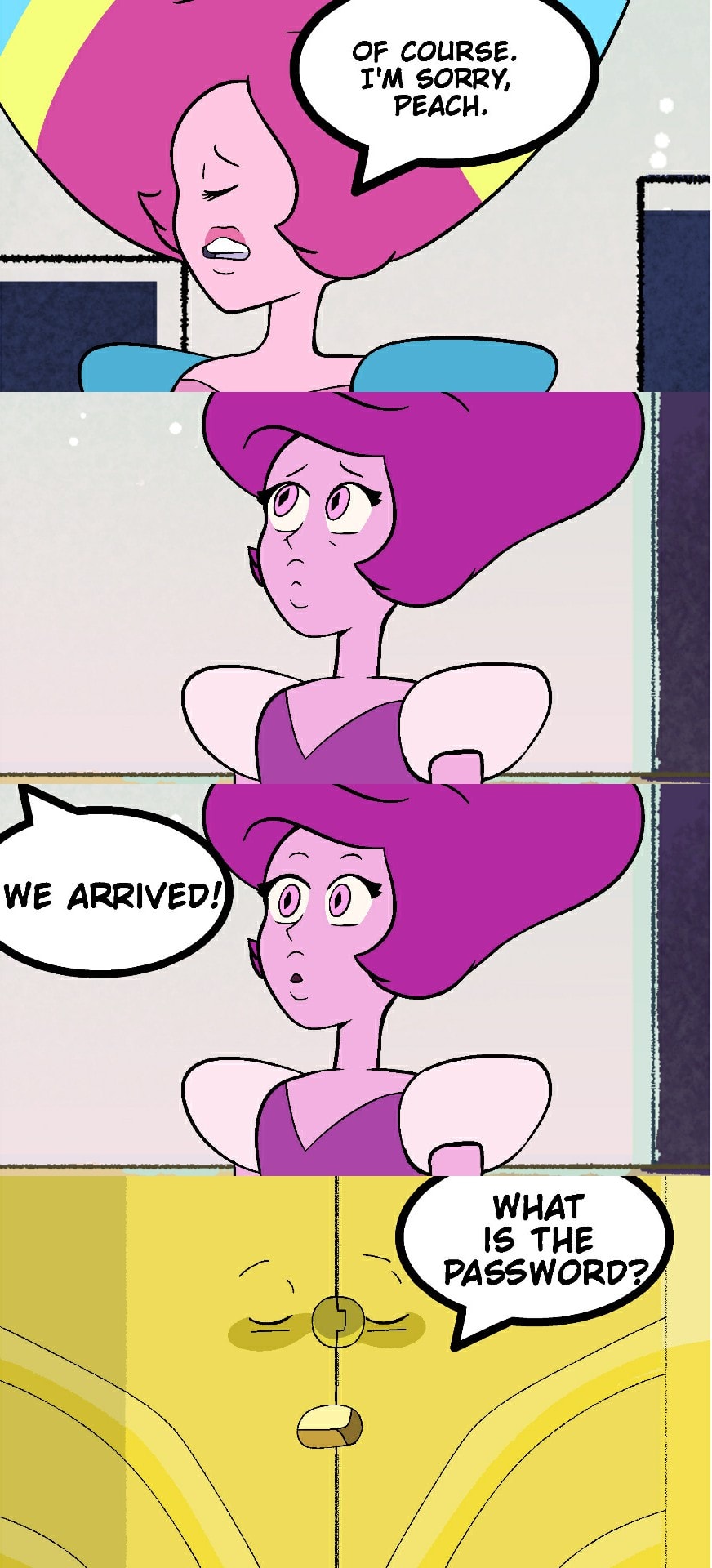 "The passage to the city is at a door" Script: –...And someday, this desert will have much more life soon... – Bi-Color, please, could you shut up for a second?! – But I was explaining to Magenta that... – I'll not talk again! – Of course, I'm sorry Peach... – We arrived! – What's the password? – Diamond! – Correct! Welcome back Peach Diamond! (PT-BR): – ...E um dia, esse deserto em breve terá muito mais vida... - Bi-Color, por favor, pode ficar calada por um segundo?! - Mas eu estava explicando para Magenta que... - Eu não vou falar de novo! - Claro, me desculpe Peach... - Chegamos! - Qual é a senha? - Diamante! - Correto! Bem-vinda de volta Peach Diamond!