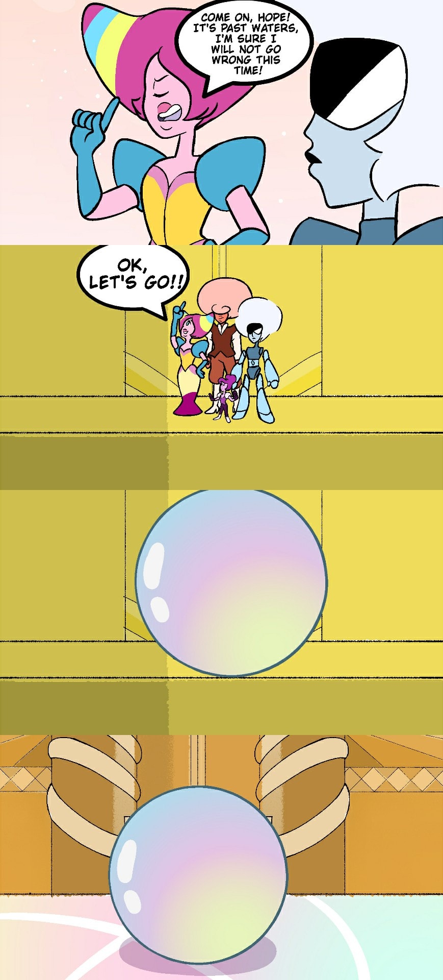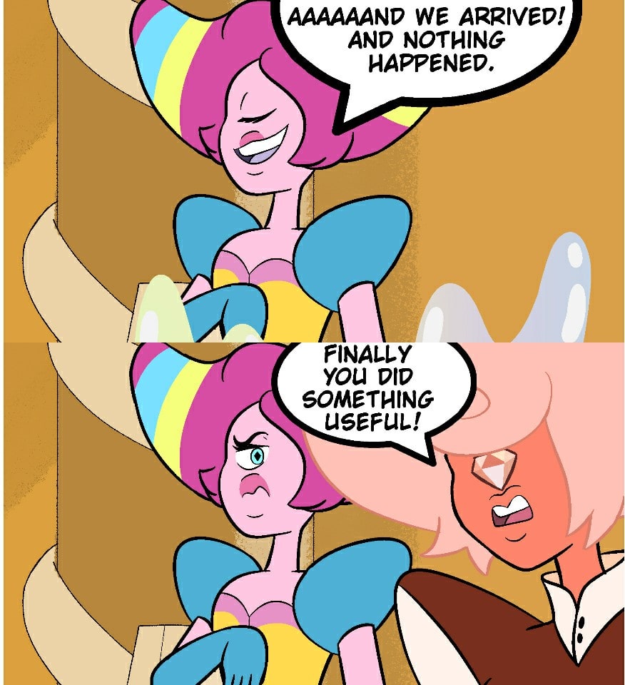 "Bi-Color helps Diamonds" Script: – Wow!! What a fantastic place!! – And if you want, I can teleport all of us to Magenta know better... – Remember when you used it, and it nearly killed us in a lava burning volcano, and after that you promised never to use it again? – C'mon Hope! It's past waters, I'm sure I will not go wrong this time! [...] Okay, let's go!! Aaaaaand... We arrived! And nothing bad happened. – Finally you did something useful! (PT-BR): - Uau!! Que lugar fantástico!! - E se você quiser, eu posso teletransportar todos nós para Magenta saber melhor... - Lembra quando você o usou isso, e isso quase nos matou em um vulcão com lava incandescente, e depois disso você prometeu nunca mais usar? - Vamos, Hope! São águas passadas, tenho certeza que não vou errar dessa vez! [...] Certo, vamos lá!! Eeeeee... Chegamos! E nada de ruim aconteceu. - Finalmente você fez algo útil!