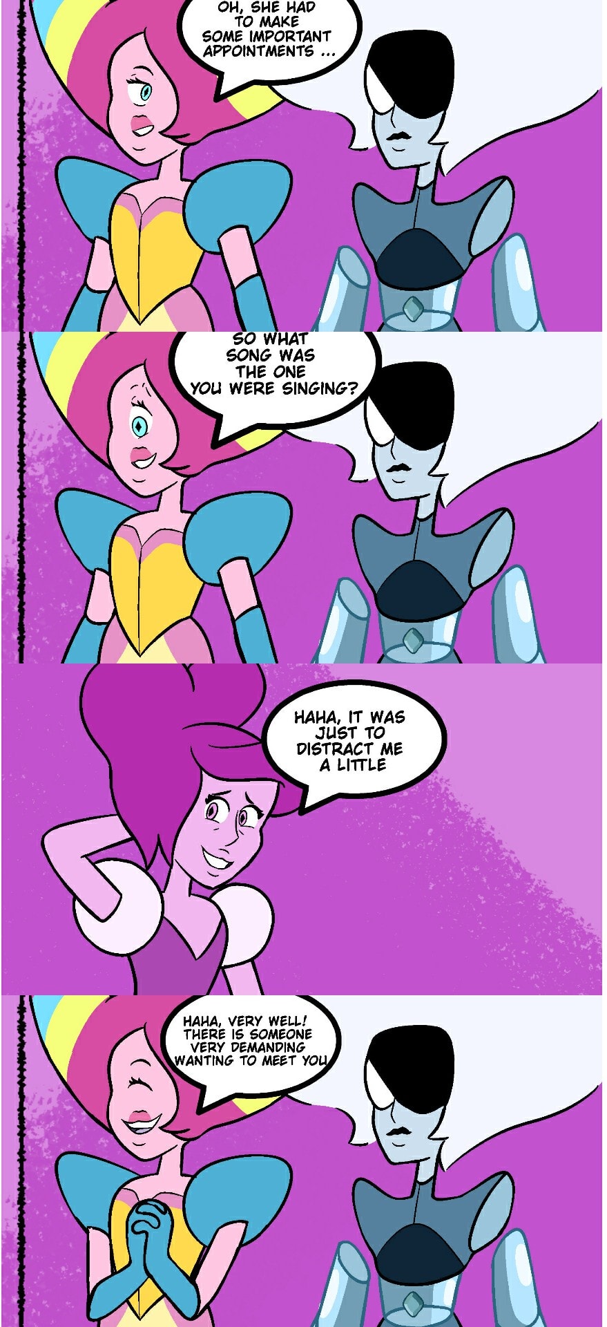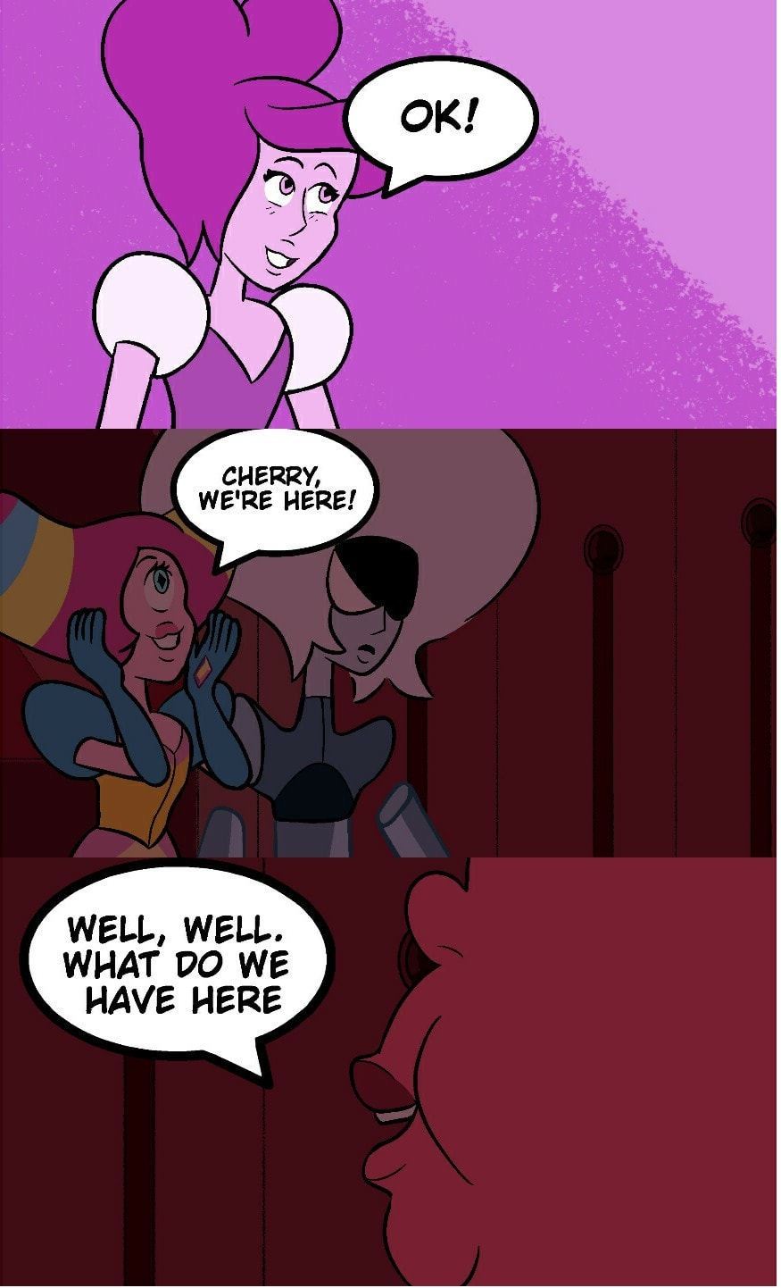 "Magenta meets Cherry Diamond" Script: – ♪...When I find you. When I see you...♪ Oh! You came back! Where's Peach? – Oh, she had to do some important appointments... So... What song was the one you were singing? – Haha, it was just to distract me a little – Haha, very well! There is someone very demanding wanting to meet you – Oh, all right! – Cherry! We're here! – Well, well... What do we have here... (PT-BR): - ♪ ...Quando eu te encontrar. Quando eu te ver... ♪ Oh! Você voltou! Cadê a Peach? - Ah, ela tinha que fazer alguns compromissos importantes... Então... Que música era aquela que você estava cantando? - Haha, foi só para me distrair um pouco - Haha, muito bem! Tem alguém muito exigente querendo te conhecer. - Oh tudo bem! - Cherry! Estamos aqui! - Ora, pra... O que temos aqui...
