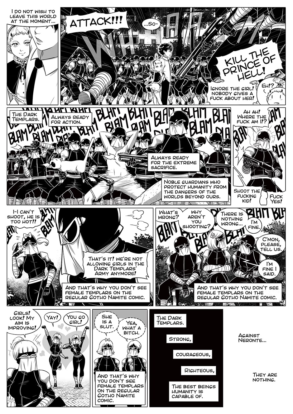 The Joke on the Dark Templars Army needs an explanation: In Italy I published a comic series called "Gotho Namite" ( look it up! ). The Dark Templars Army exist in that comic series also, but they are all male. This webcomic is set 18 years before the events on the Gotho Namite series, and there are a few females.