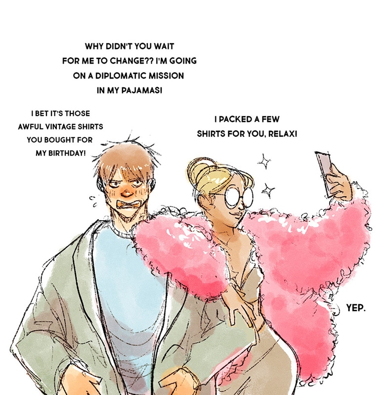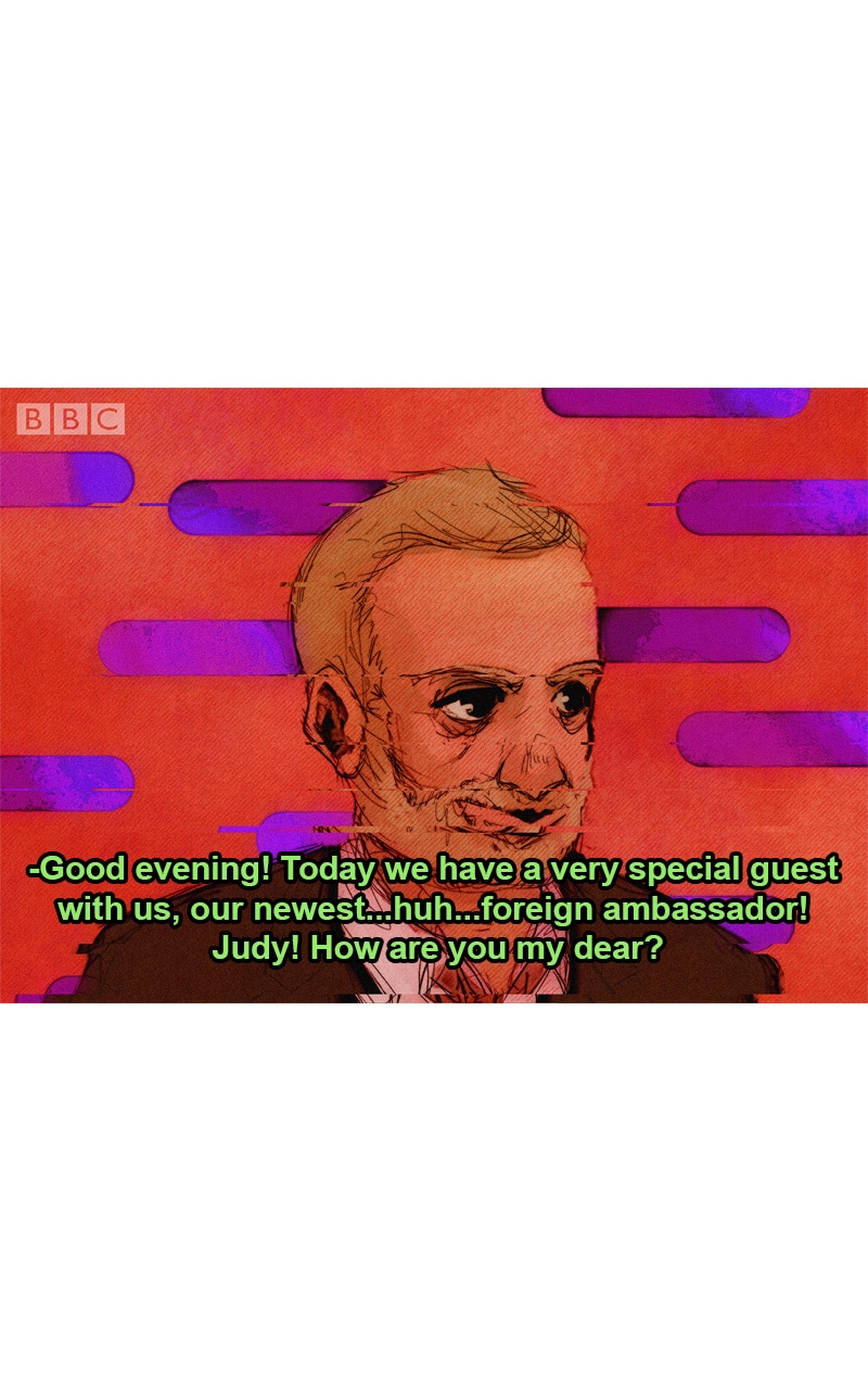 Judy is killing it as a foreign ambassador. Harold is just jealous he has to wear pjs.