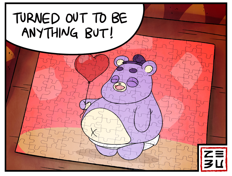 He has a pretty red balloon for you though... It's even heart shaped!
