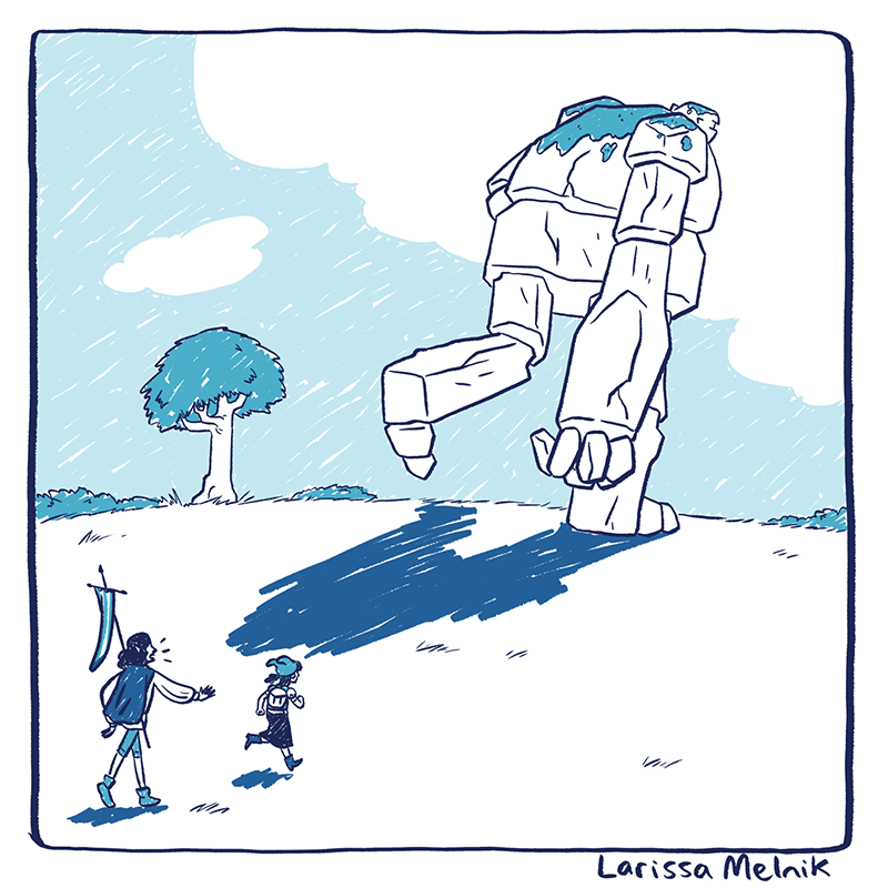 Original prompt: Giant character walking through field